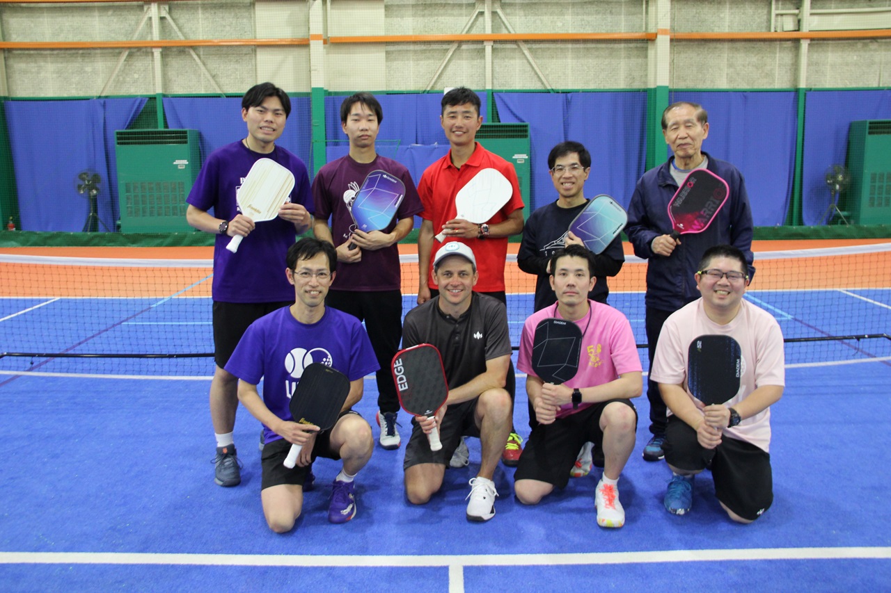 ピックルボールとはバドミントンコートと同じ広さのコートで板状のパドルを使い、穴あきのプラスティック製のボールを打ち合うスポーツです。穴あきのボールが風の抵抗を受けボールのスピードが緩まるため、少しの練習でラリーが楽しめます。テニス経験者の場合は15分ほどですぐにゲームが出来るようになります。今年1月・2月でピックルボール短期教室をおこないましたが、さらにレッスン内容を充実させる為、国内ピックルボール普及の第一人者である元全米チャンピオンのダニエル・ムーア氏の講習を社員で受講しております。