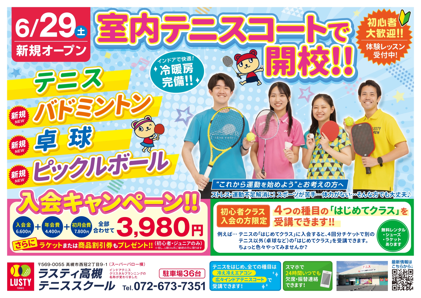 オープン記念でご入会時お得なキャンペーン中で、お得な金額で始められます。初心者クラスではラケットプレゼントもあります。この機会をお見逃しなく。