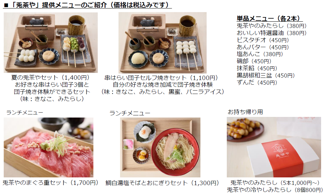 住吉大神は神道で最も大事な「祓(はらえ)」を司る神様です。単に「おはらい」と言えば住吉大社の夏祭り「住吉祭」を指すこともあるほど「祓の神」として篤く敬われています。このような歴史を大切にするため、「兎茶や」は日本初(※当社調べ)の串はらい団子専門店としてオープンします。住吉大社が「兎」を神様の使いとしていることから、店名にもその名を冠しました。串はらい団子には、健康の問題や事故などの災い=苦と死(串)を取り払い、お客様の末永い幸せを願うという想いを込めています。住吉大社で毎月最初の辰の日に商売繁盛を祈願して行われる「初辰(はったつ)まいり」の日には、当店では団子に「初辰まいり団子タグ」をお付けして提供。安産祈願のお参りで賑わう戌の日にも、皆さまの願いが叶うお手伝いができればと特別メニューを用意します。さらに住吉大神が海から出現したことで「海の神」としての信仰もあることから、海の恵みを感じさせる食材を使ったランチメニューも提供予定です。