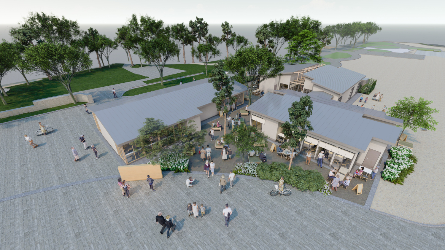 大阪府が住吉大社から駅を挟んで西側に位置する住吉公園に、公園の一部区域を民間事業者が整備運営する制度「Park-PFI」を導入し事業者を募集したことを受け、当社と株式会社E-DESIGNの共同事業体が、日本最古の公園の一つである住吉公園の歴史的な資産や景観を活用し、住吉大社への参拝に訪れた人や、地域の公園利用者が立ち寄れる飲食店を提案し、整備運営事業者に選定されました。 住吉公園はもともと住吉大社の境内で、公園中央を東西に走る「汐掛道(しおかけみち)」は住吉大社の表参道でしたので、これにあやかり、施設の名前も「住吉公園汐かけ横丁」としました。