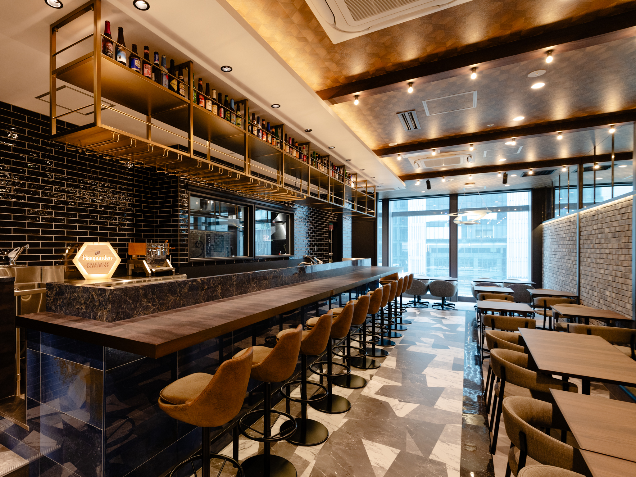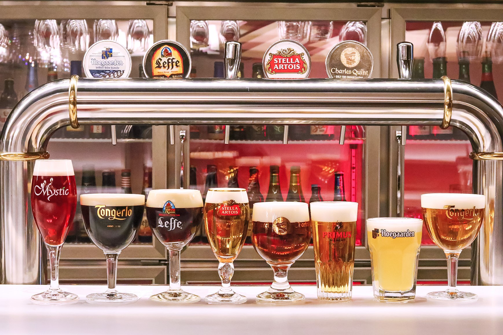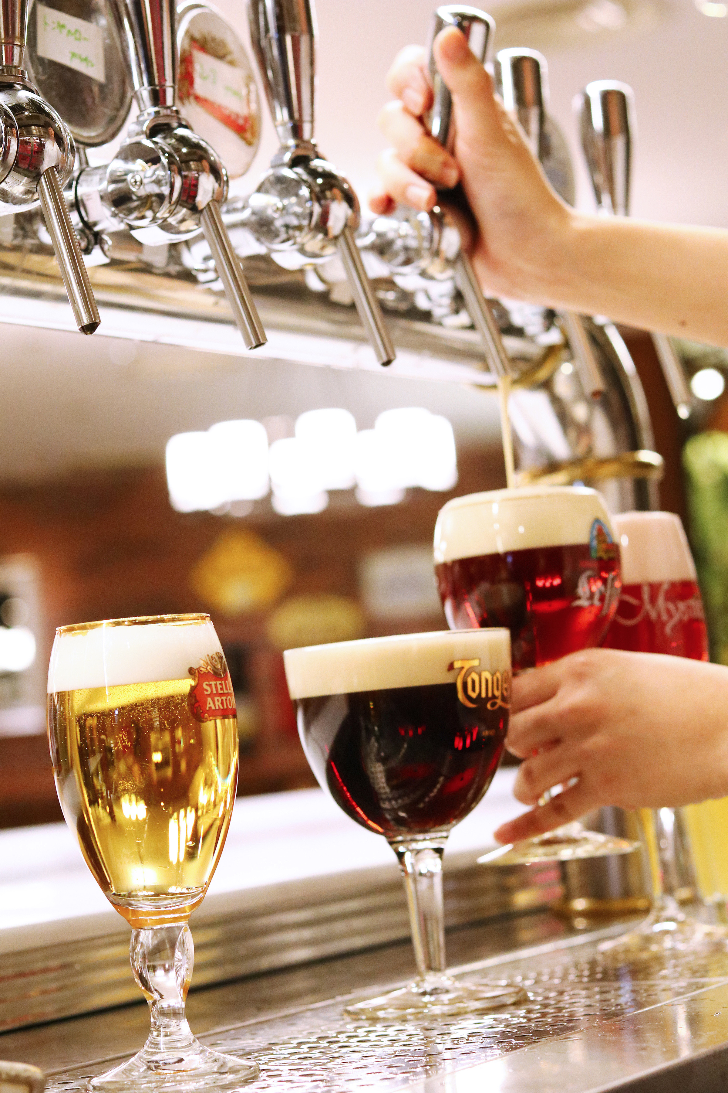 カウンターに設置したビールタップでは、さわやかな飲み口の「ヒューガルデン」やドライな味わいの「シメイ・ホワイト」、フルーティーな酸味と甘みの「ミスティック チェリーorピーチ」(以上539円~)などベルギーを代表する銘柄を樽生でご用意。瓶ビールは、「リンデマンス・クリーク」(1,320円)や「デリリウム・レッド」(1,650円)などビールが苦手な方でも楽しめるフルーツビールもご用意しています。