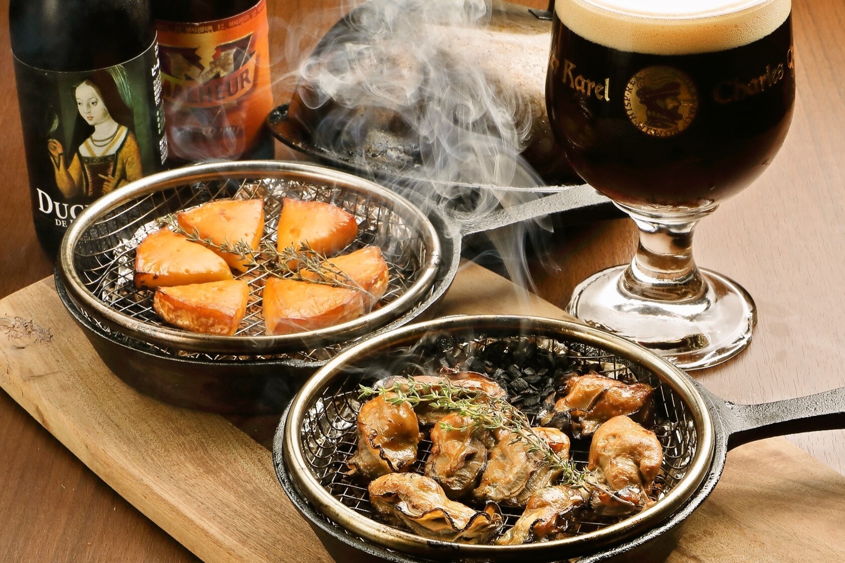 カマンベール、サーモン、牡蠣などの食材ごとに、温かい燻製と冷たい燻製を使い分けます。