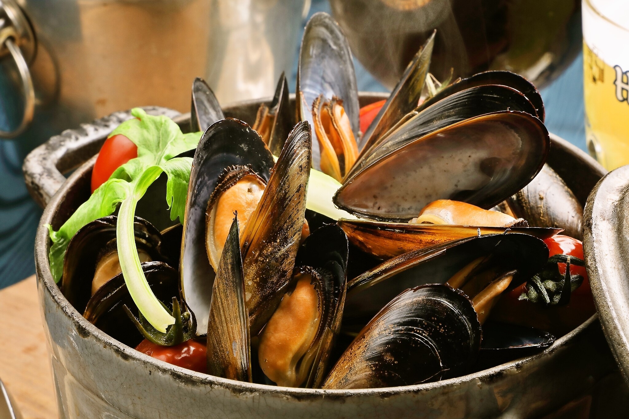 エールビールで鍋いっぱいのムール貝を蒸した一品。