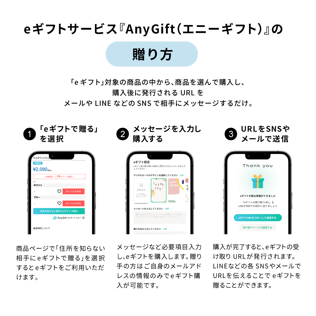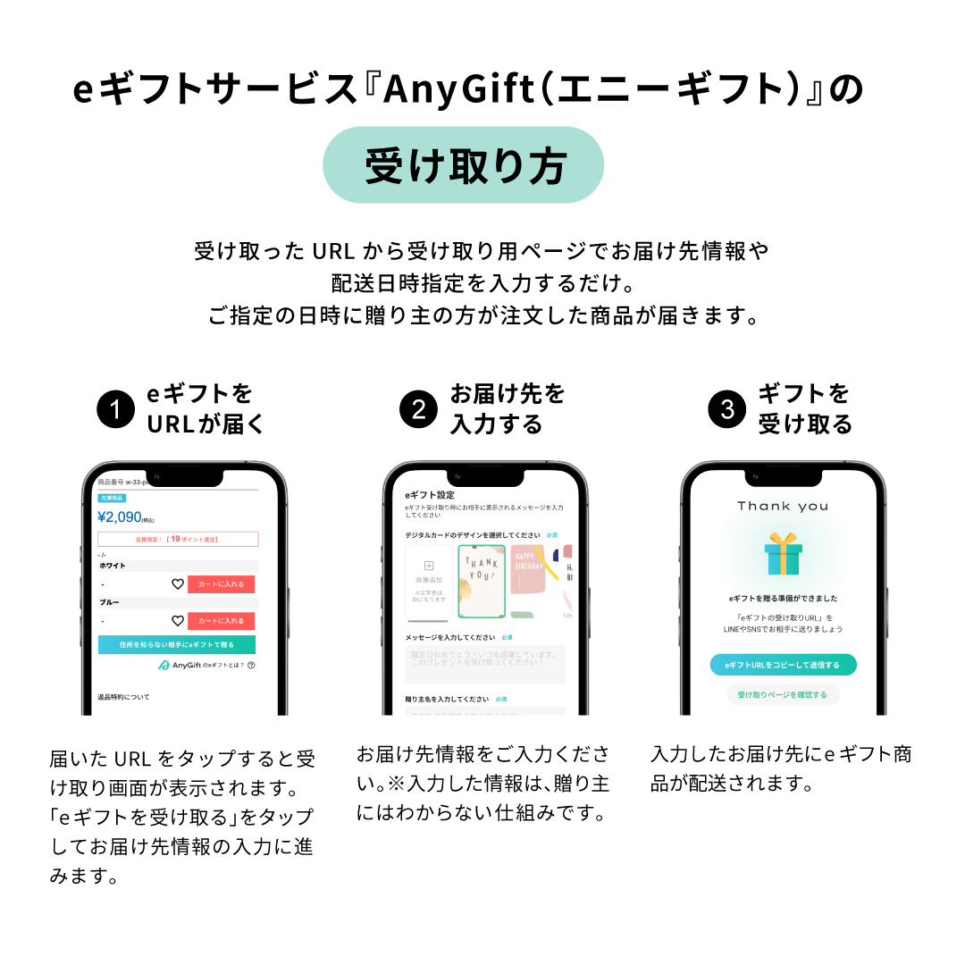 『AnyGift(エニーギフト)』は、お相手の住所を知らなくても、LINEやメール・SNSのDMなどで受け取りURLを送ることでギフトを相手に贈れるサービスです。URLを送った後にお相手が受け取り住所を入力することで、購入した商品がギフトとして届きます。