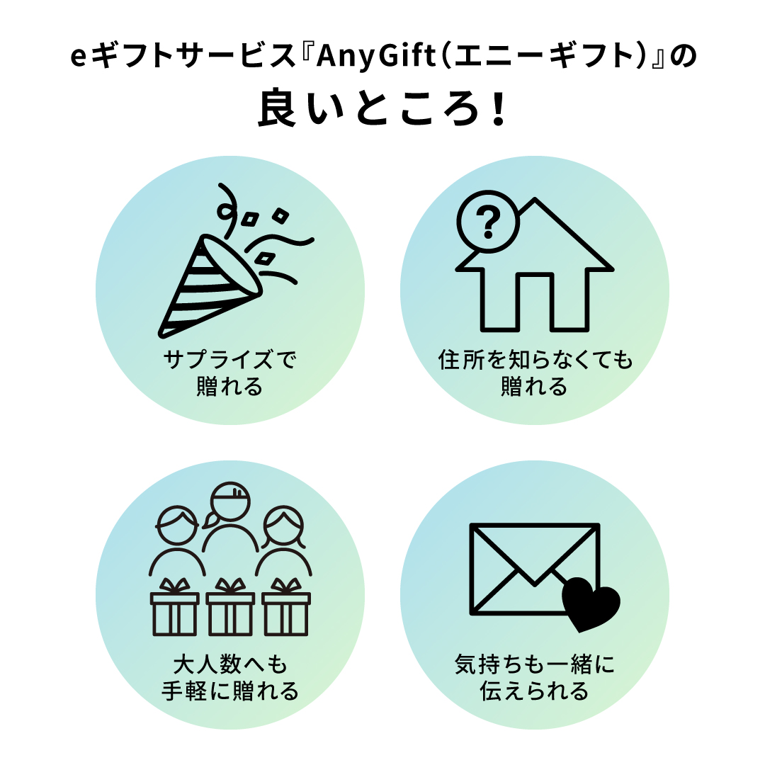 しかし、この度いつでも手軽に大切な方に想いを込めたギフトを贈ることができる環境を整えることで、「住所を聞くのが気が引ける」「会って直接渡したいけど会えるタイミングがなかなかない」など、あらゆるニーズの変化や多様なつながり方に応えたいという想いから、eギフトサービス『Any Gift』を導入いたしました。