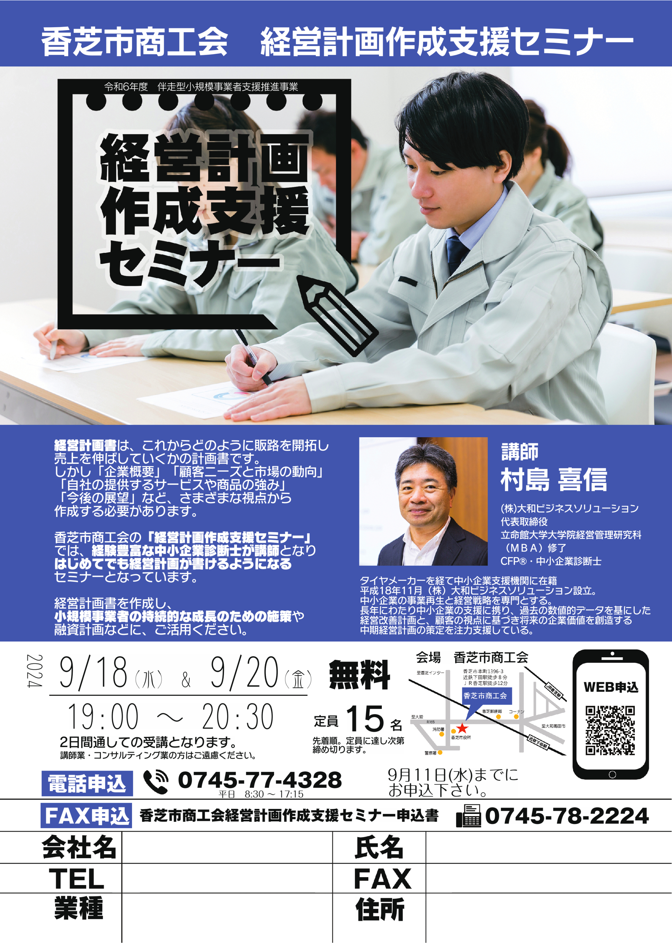 香芝市商工会(所在地:奈良県香芝市)は、今後どのように自社の販路を開拓し、売上を伸ばしていくかをまとめた経営計画書の作成について学べる「経営計画作成支援セミナー」を令和6年9月18日(水)・20日(金)の2日に渡って開催し、さらにセミナーの参加者に対して個別相談会も開催することをご報告いたします。