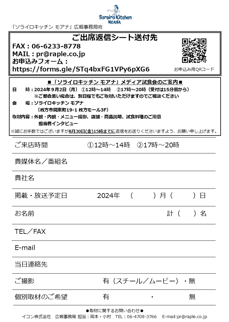 関西を中心に飲食店を展開するイコン株式会社(本社:京都市下京区、代表取締役:佐野哲也)は2024年9月6日(金)、ハワイアンカフェレストラン「ソライロキッチン モアナ」を京阪枚方市駅直結の新商業施設「枚方モール」(枚方市岡東町19-1)3Fにオープンします。オープンに先駆け、9月2日(月)にメディア様向け試食会を開催いたします。