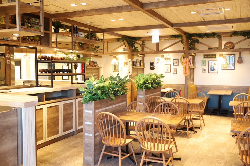 店内は、ゆったりとしたソファー席、外の景色を楽しめる半テラス席などをご用意。駅直結立地ながらハワイにいるかのようなリゾート気分を味わっていただけます。