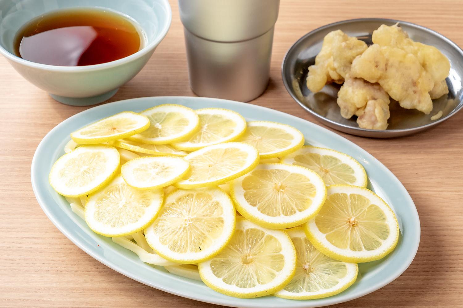 このほか、名物メニューとしてコラーゲンたっぷりの「とろ豚足」(1個350円~)、皿からはみ出るくらいの大きな羽根をまとった「羽根付き焼き豚足」(1個390円~)もスタンバイ。〆には、輪切りレモンを敷き詰め、さっぱりとお口直しいただける「ホルモン天ぷらつけうどん」、さらにスタミナを付けたい方には「ホルモン焼うどん」 (以上1,090円)をご用意しています。