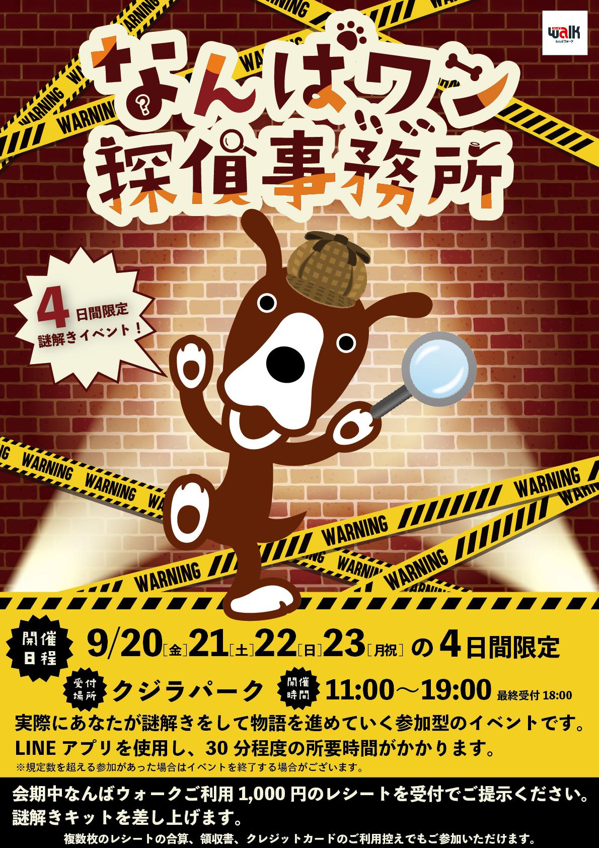 参加者は、なんばウォークのキャラクター「なんばワン」の助手として、謎解きに挑戦。クジラパークをスタートし、フォレストパーク、ニュースパークの3つの広場を巡りながら手がかりを探し、謎を解き明かしていただきます。