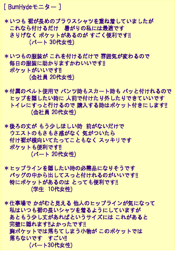 ★持ち運びもできるのでいざというと時に簡単に装着ができるのでヒップラインの汗じみなどを隠したい時に便利!