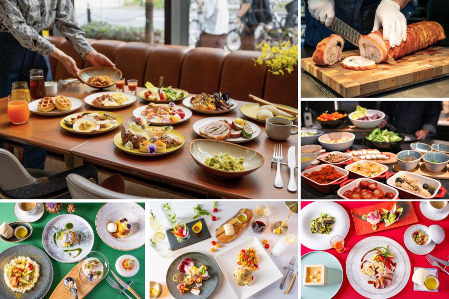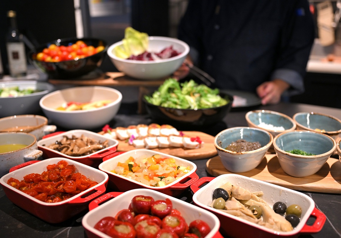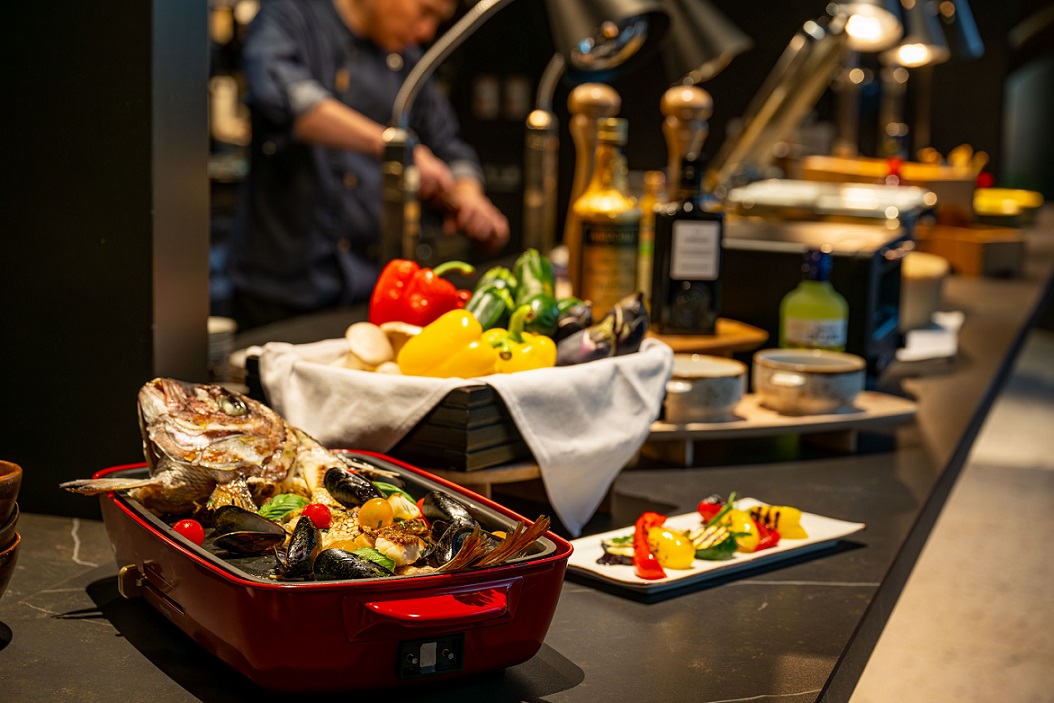 ライブキッチンで仕上げる自家製手打ちパスタ、イタリアの伝統的な豚の丸焼き「ポルケッタ」、白みそや豆腐など和の食材を使ったイタリア料理、サフランリゾットやアンガス牛のグリルなど温製料理、スイーツなど約40種類のメニューをブッフェスタイルでお楽しみいただけます。