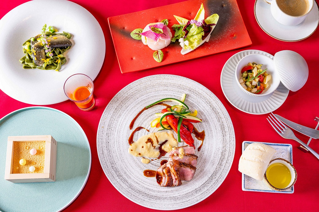 ディナーは、お客様ひとりひとりの気分に合わせてお選びいただけるようイタリアンコース3種類をラインナップ。南イタリア・プーリア州出身のエグゼクティブ・シェフが手がける“トラディショナル”では、同州の郷土料理でチーズや野菜を豚肉で巻き串に刺した「ボンベッテ」をメインに、リゾットやカポナータなど伝統的なイタリア料理をご用意。和の食材・技法とイタリアをかけ合わせた“フュージョン”では、豆腐と白味噌のムースで仕上げた真鯛のカルパッチョや大阪ハニーとバルサミコ酢のソースをかける鴨のローストなど創作イタリア料理をご提供。カクテルを含む飲み放題付き“カジュアル”では、前菜の8種盛りや自家製手打ち麺のパスタとメインを盛り合わせたワンプレートなど、気軽にお楽しみいただけるメニューをそろえています。