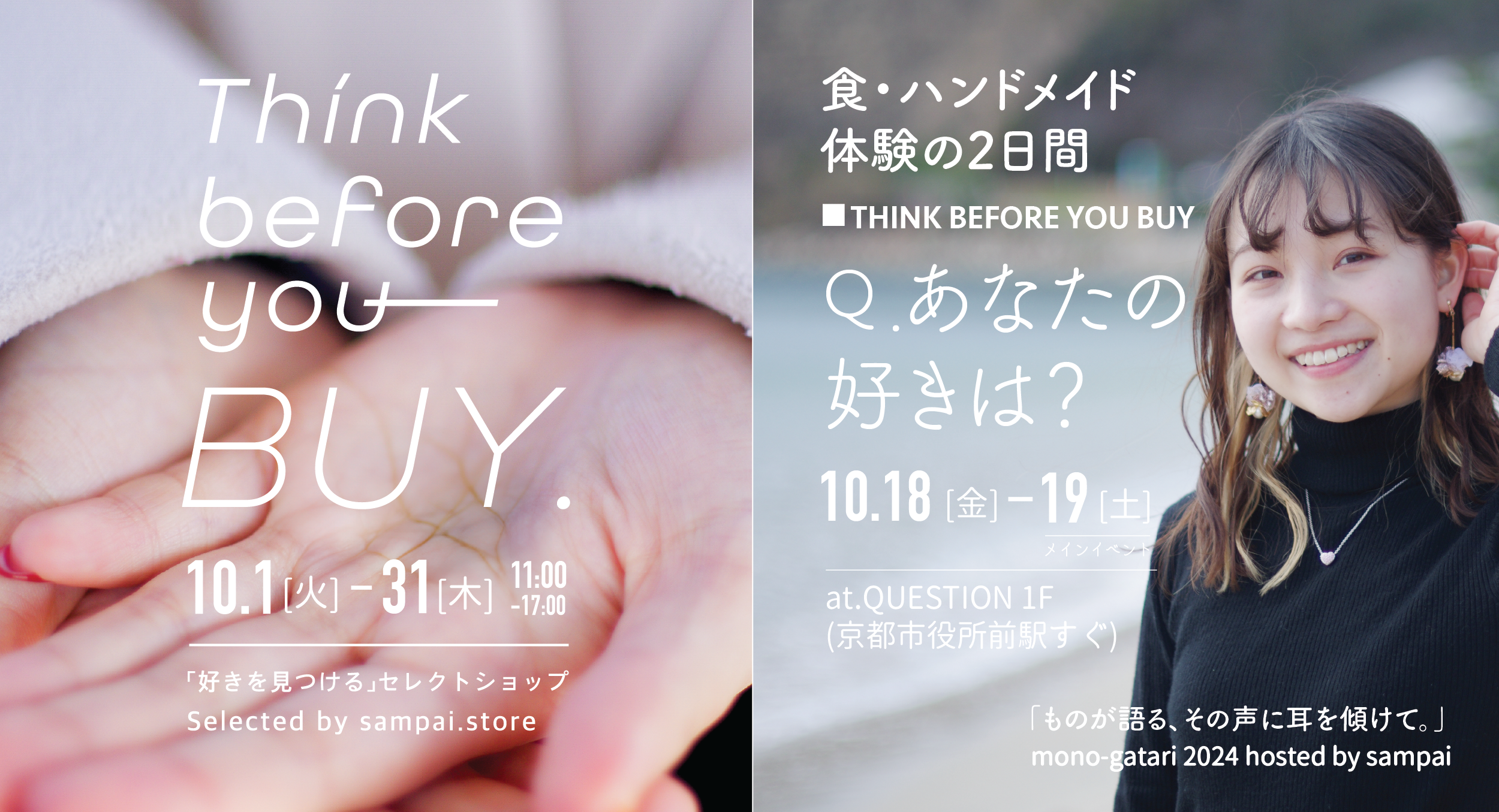 京都西陣地域で伝統産業から出る産廃素材をアップサイクルするブランド「sampai(さんぱい)」が、期間限定のセレクトショップをオープンし、連動型マルシェを開催決定。10月の1ヶ月間、河原町御池のQUESTIONビル1階に地域企業のサスティナブル・文化伝承をコンセプトとしたセレクトショップ「Think before you buy.」をオープン。ショップに連動し、10月18日(金)・19日(土)に、作り手に会う・体験する多業種合同マルシェ「mono-gatari 2024」を実施する。本企画は、地域企業のサスティナビリティや伝統文化保全・継承に重きを置き、商品背景の理解を通した消費行動の見直しにより地産地消の促進を目指します。