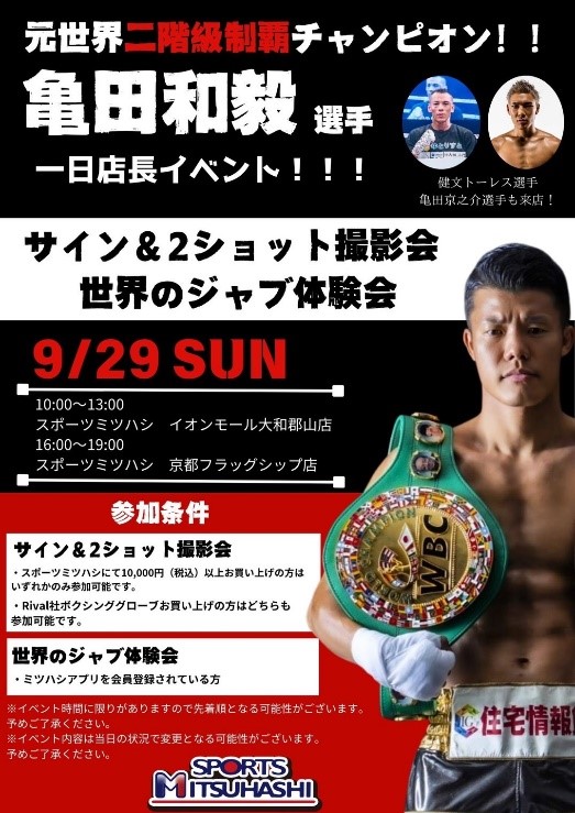 株式会社スポーツ館ミツハシ(本社:京都府下京区、代表取締役:山越 悠登)は2024年9月29日(日)スポーツミツハシイオンモール大和郡山店及び京都フラグシップ店にて特別イベント「亀田和毅選手1日店長」を開催いたします。1日を通して2店舗にご来店いただきイベントを実施いたします。