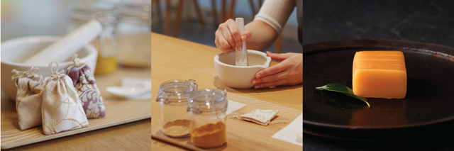 ホテリエが実施するワークショップはsampaiが開発。フクオカ機業が製織する京都府下のペットボトルを再利用した再生ペット西陣織で作る巾着に、天然香料を参加者が自身で調合し、香袋にするワークショップである。体験後は同じく西陣の京菓子司 金谷正廣と同ホテルがコラボレーションして作る梅羊羹とほうじ茶が提供される。