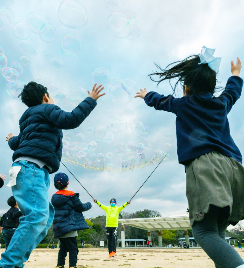 もりねき広場に舞い上がる、きらきら、ふわふわのシャボン玉を追いかけよう♪