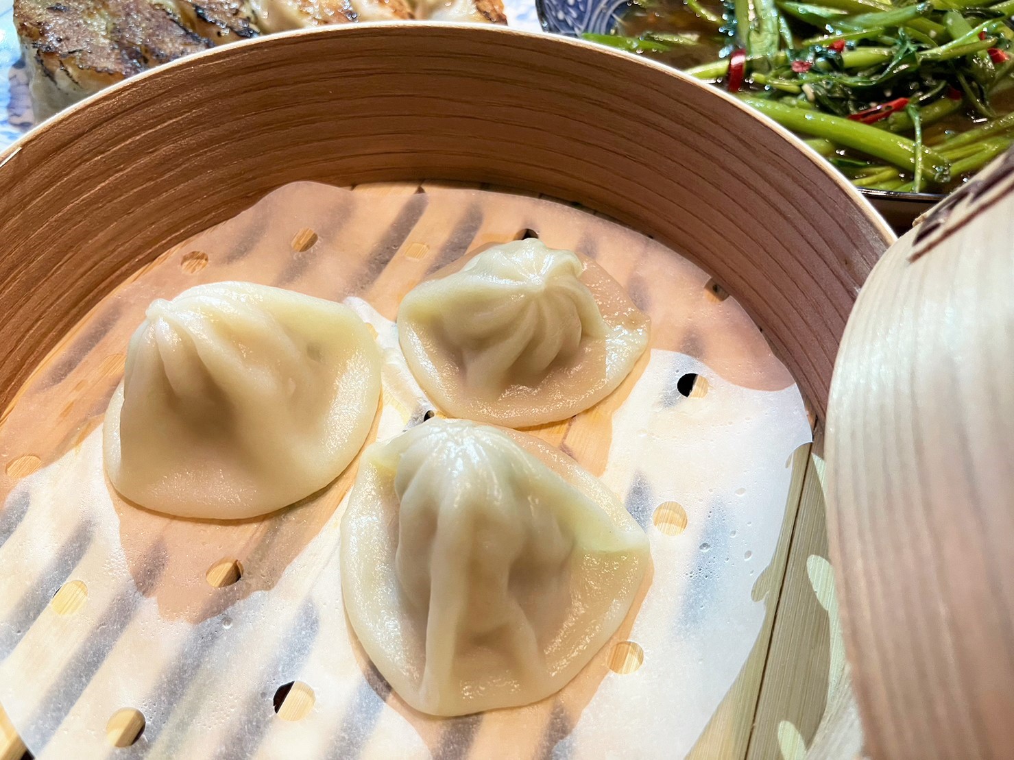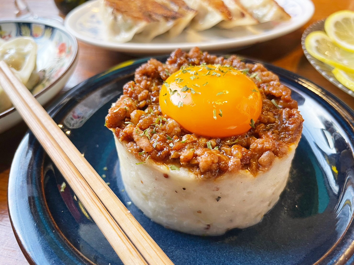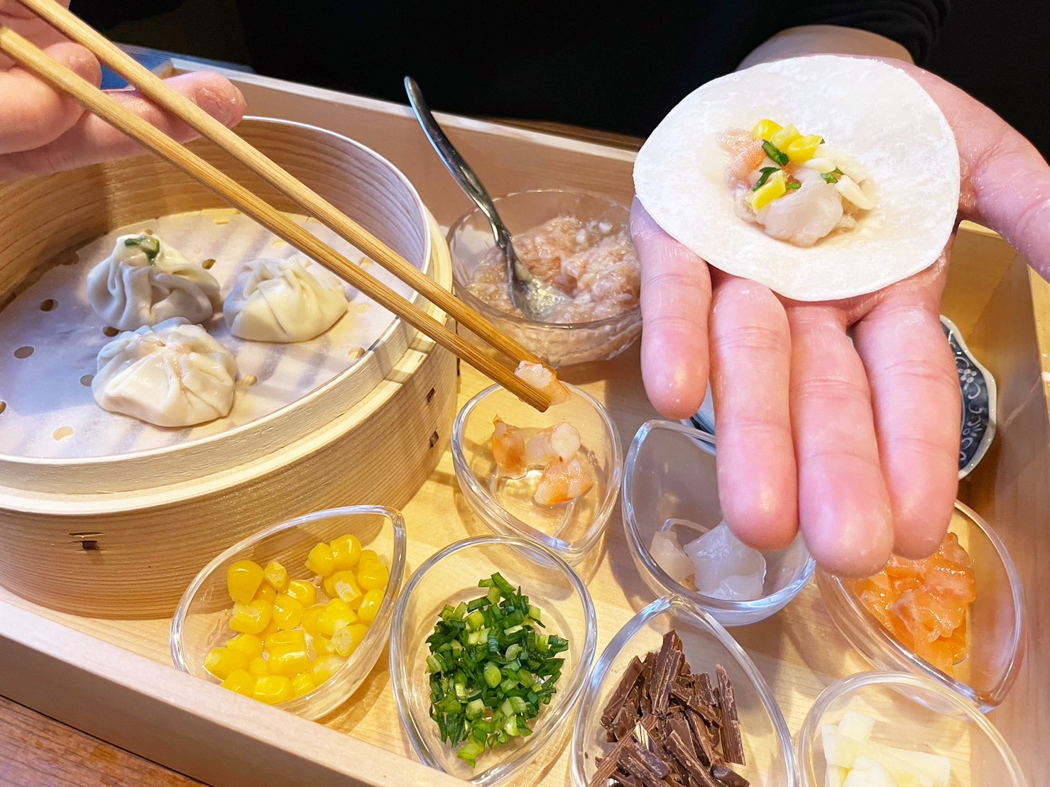女性注文率100%の看板メニューは、小籠包作りを体験できる「Let’s小籠包!」(440円)。作り方を紹介する動画を参考に、特注の皮で豚肉の餡とエビやコーン、チーズ、チョコレートなどお好みの具材を一緒に包んでいただきます。このほか点心メニューは、肉汁が溢れ出す「スタンダード小籠包」(528円)、皮の代わりに大葉で餡を包んだ「大人の大葉焼売」(638円)などをご用意。一品料理は、自家製そぼろと卵黄をのせた「ふぅふぅポテサラ」(638円)、尾頭付きのエビを使った「大エビのチリマヨネーズ」(979円)、春巻きにエビチリとチーズが入った欲張りな「エ!ビっちりチーズ揚げ春巻き」(638円)など中華料理をアレンジしたアテを50種類以上そろえています。〆のルーローハンは、お腹の空き具合や人数に応じて、茶碗と土鍋の2サイズをご用意しています。