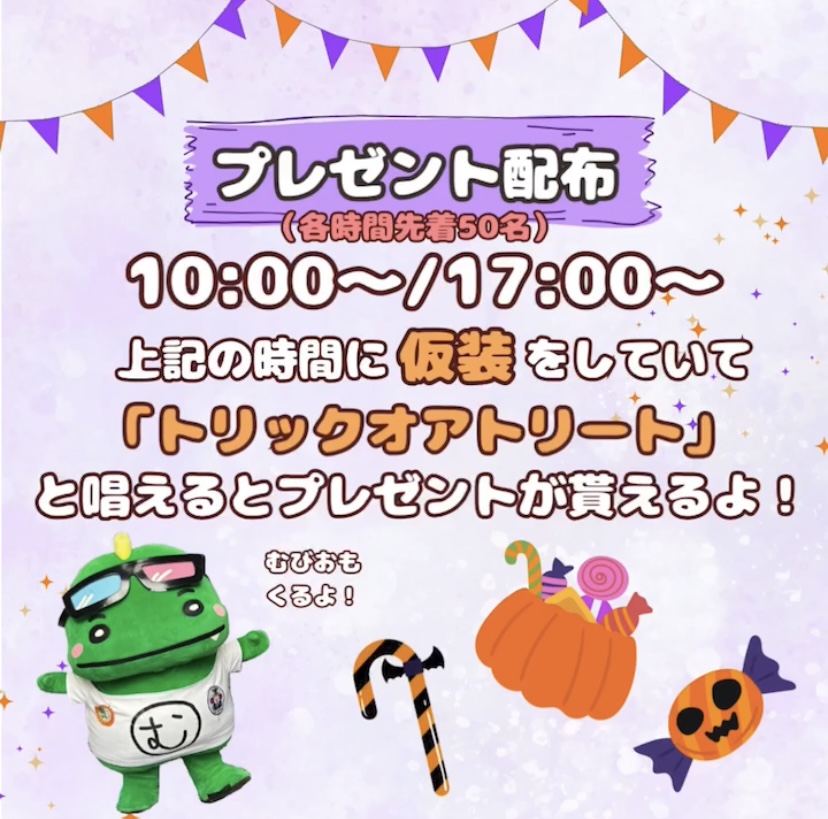 ハロウィンファッションショーは、子どもはもちろん、親子ペアやファミリー、大人も大歓迎! 仮装をして遊びにきてね♪ゆるキャラグランプリ5位のむびおも来るよ♪