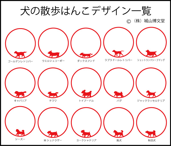 ハンコの丸い外枠を道に見立て、そこを散歩する犬の姿を控えめにデザインしています。