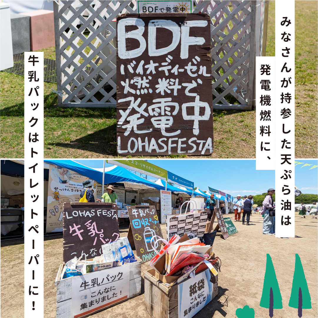 ロハスフェスタでは、使用済み天ぷら油、牛乳パックなど、ご家庭の不用品を回収する「エコリサイクルコーナー」を設けています。特に使用済み天ぷら油は、精製して会場で使用する発電機の燃料(バイオディーゼル)に、牛乳パックは会場内トイレのトイレットペーパーに生まれ変わります。