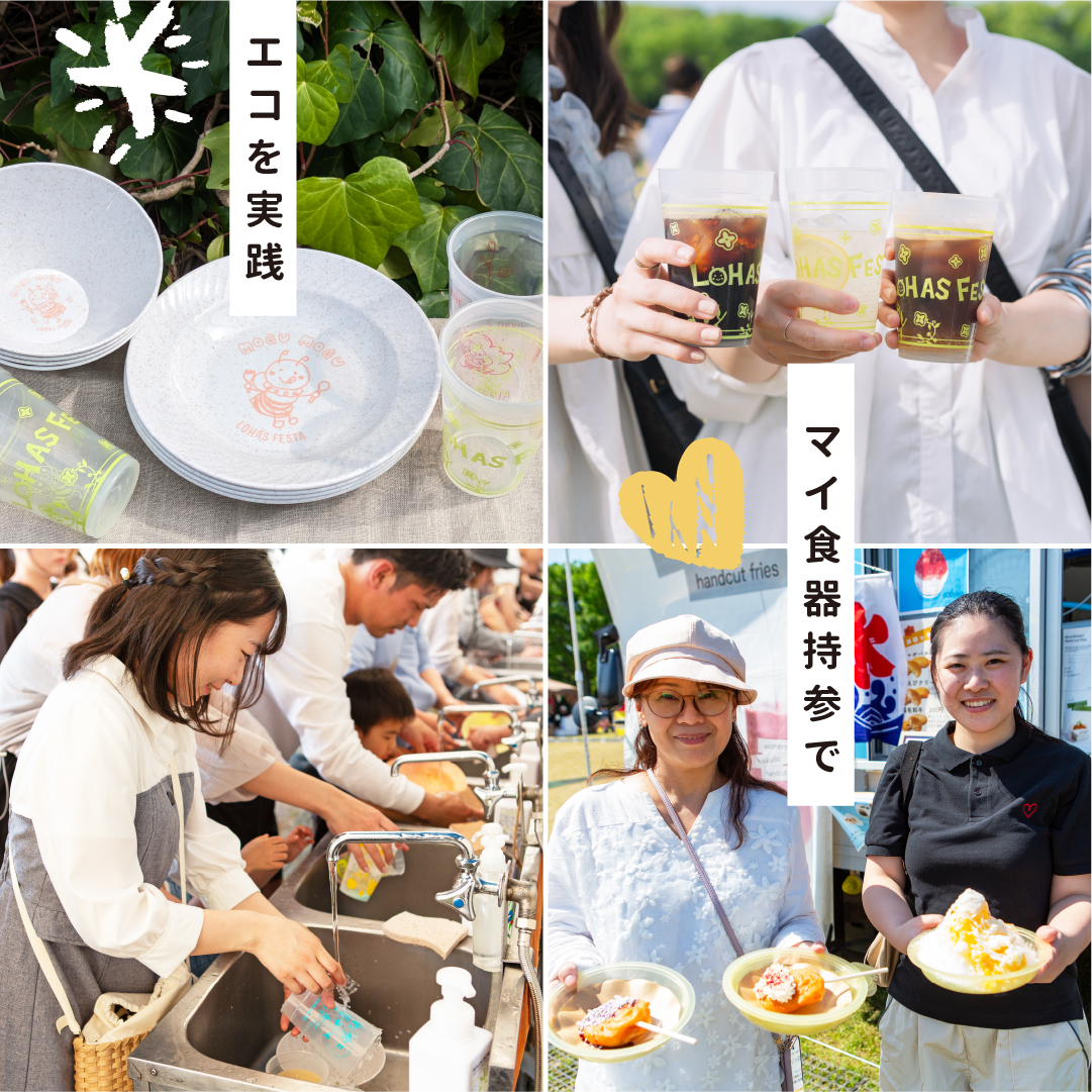 また、マイ食器・マイボトルの持参を呼び掛け、会場内はリユース食器(何度も繰り返し洗って使用)を使用し、使い捨て容器を減らしてゴミゼロを目指しています。