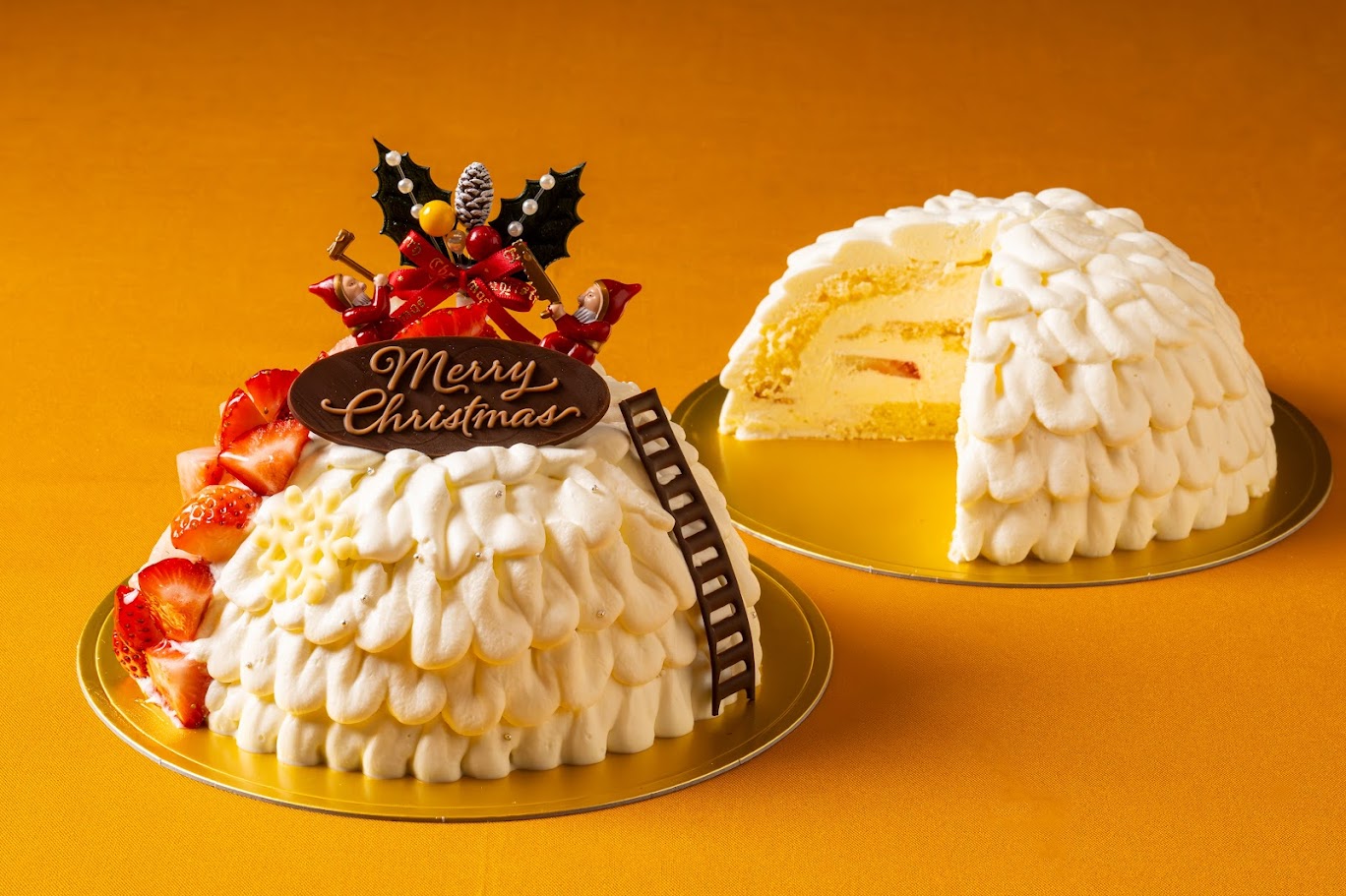 トスカーナ地方発祥のイタリア伝統菓子である丸いドーム型のケーキ「ズコットケーキ」を“雪山”を思わせるショートケーキにアレンジ。ふんわりとしたスポンジ生地の中に、たっぷりの北海道産クリームとイチゴを詰め込みました。表面は、生クリームをフリル状に重ね、作業する雪の妖精のオブジェを飾り付けました。5号サイズとお一人様でお楽しみいただける小さいサイズでご用意します。