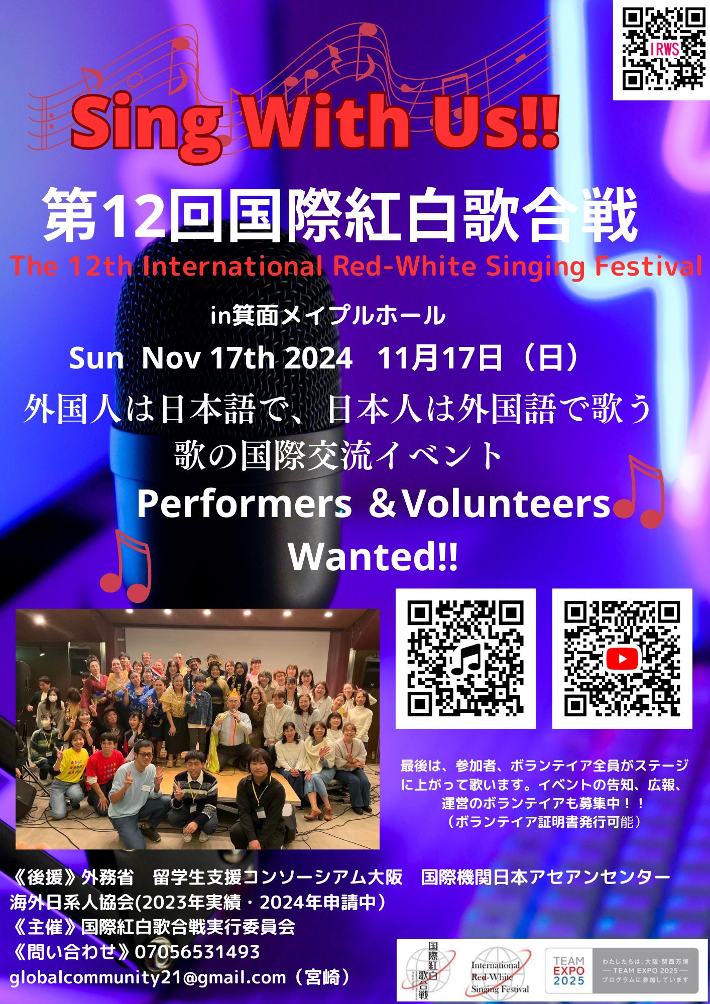 日本に住む外国人や将来を日本に賭ける留学生などの多くは何とか日本の社会を明るくしようと頑張っています。私たちは、『国際紅白歌合戦』を通して、思いやりのある社会を皆さんと一緒に作っていきたいと思います。介護施設やコンビニ、飲食店、インバウンド関連企業などでは、外国人の人たちはなくてはならない大きな力になっています。しかし、日本に住む外国人の人と交流のある方もまだまだ少数派。このイベントを通して一人でも多くの方々にその楽しさを体験してもらいたいと思います。今回、12回目は、11月17日(日)13:30開演、箕面メイプルホール(大阪府箕面市)で開催されます。入場無料。 https://www.irws.org https://team.expo2025.or.jp/ja/challenge/1248