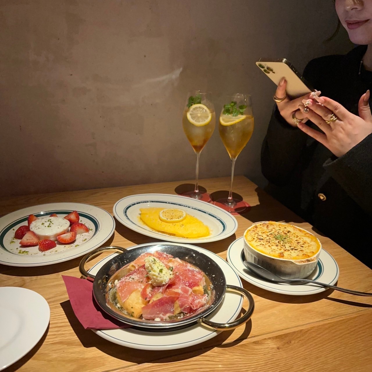 インスタで映えるおすすめのフードメニューは、「~燻製ムースと食べる~ふわふわレモンオムレツ」(1,210円)、「lingerie生ハムゼッポリーニ」(1,408円)、「フルーツチーズアイスクリーム」(869円)です。このほか、「季節フルーツとまんまるブラータ」(1,848円)、 「牛ハラミのステーキ~ブルゴーニュバター~」(1,628円)、「天使の羽パスタカチョエペペ」(1,210円)など約20種類をそろえています。