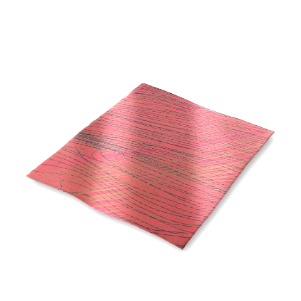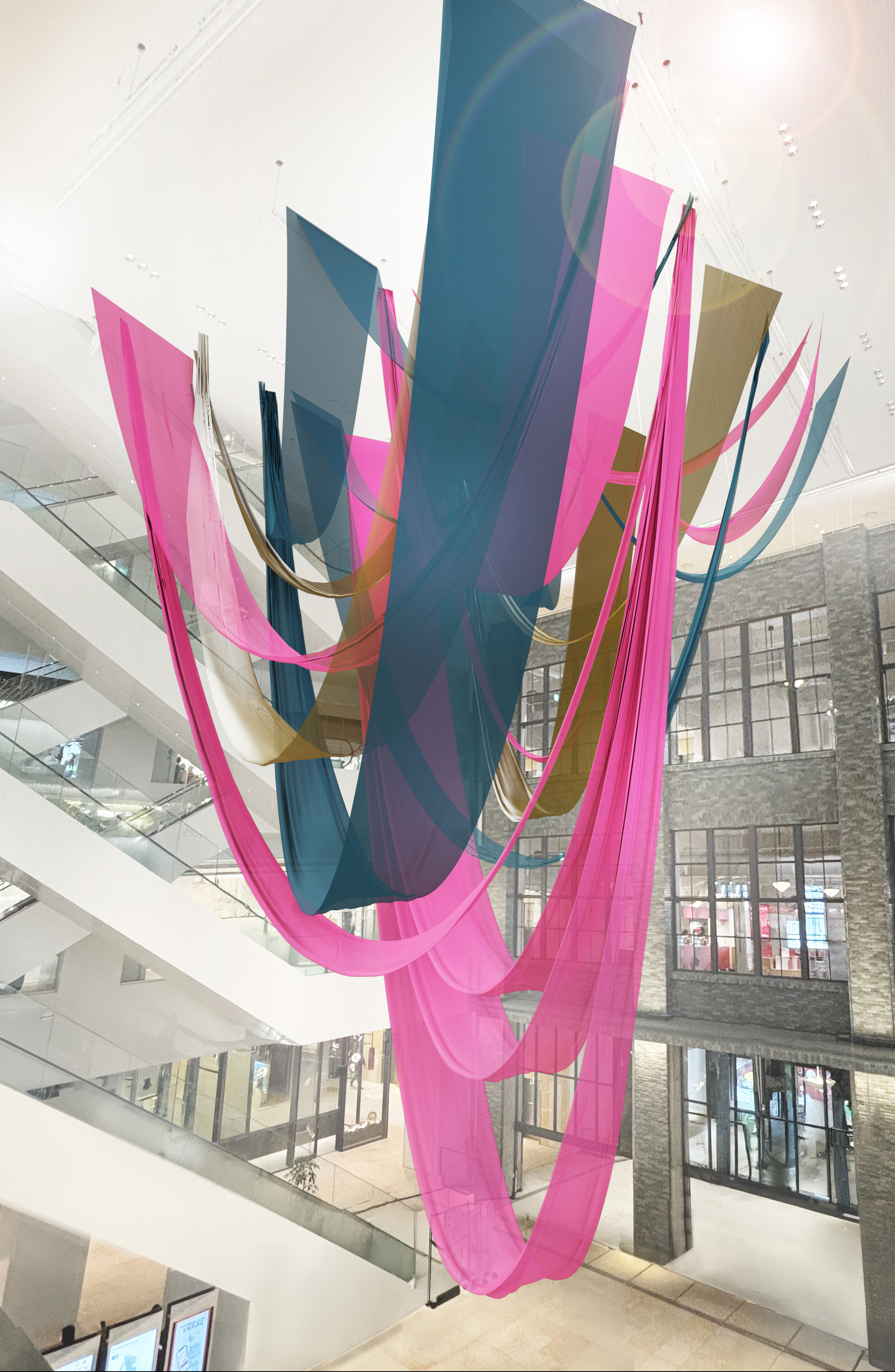 重力による美しいドレープをかたちづくりながら、透明感のある長短のファブリックが吊られ、さまざまな角度で無作為に交じりあう。生命のエネルギーが集まり、交わり、繋がり、活動的に動き自然な流動が起きている様。オーナメントやシャンデリアのような装飾をも連想させ、ゴールド、グリーン、そしてピンクの3色がクリスマスを祝福します。
