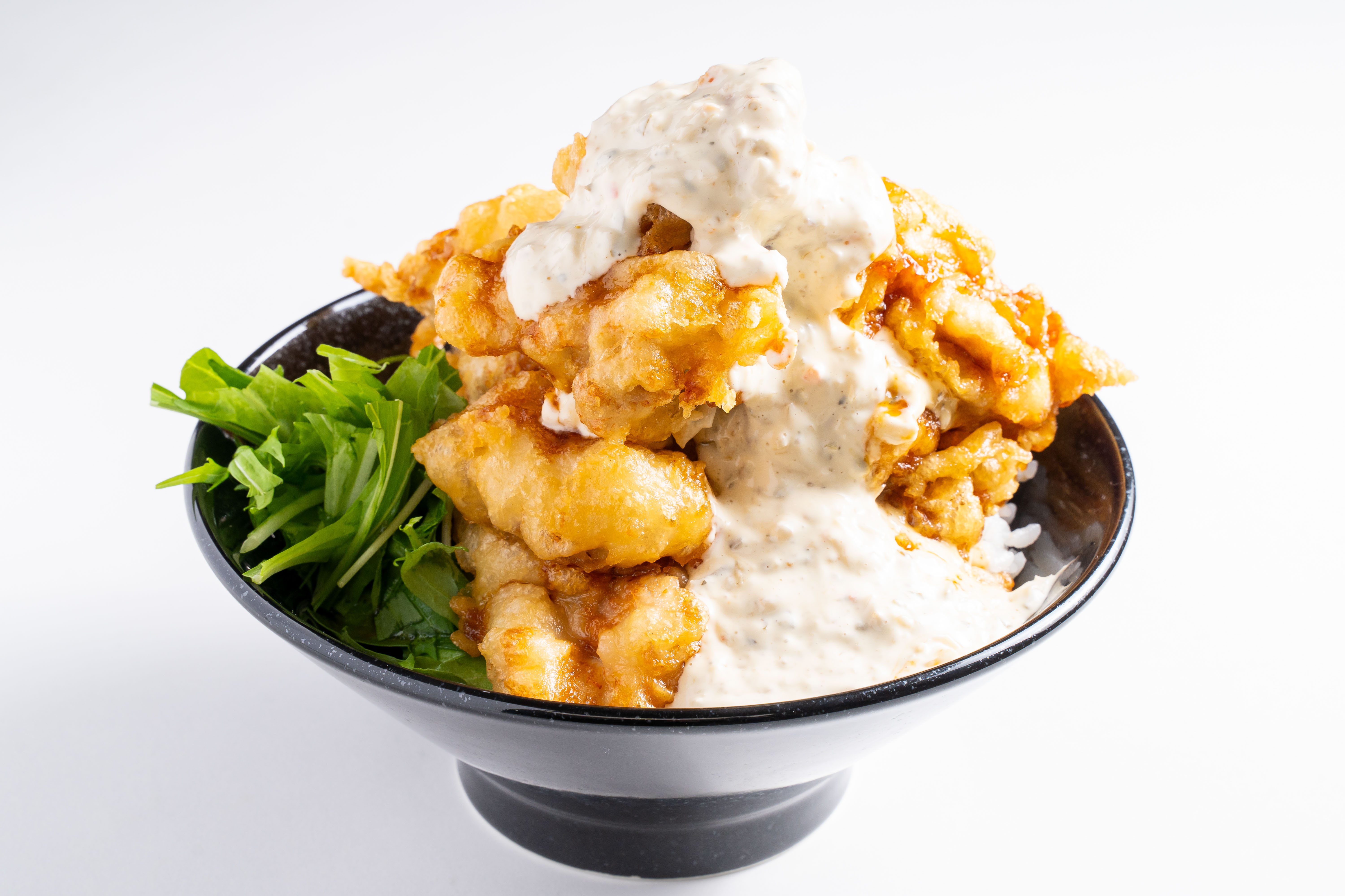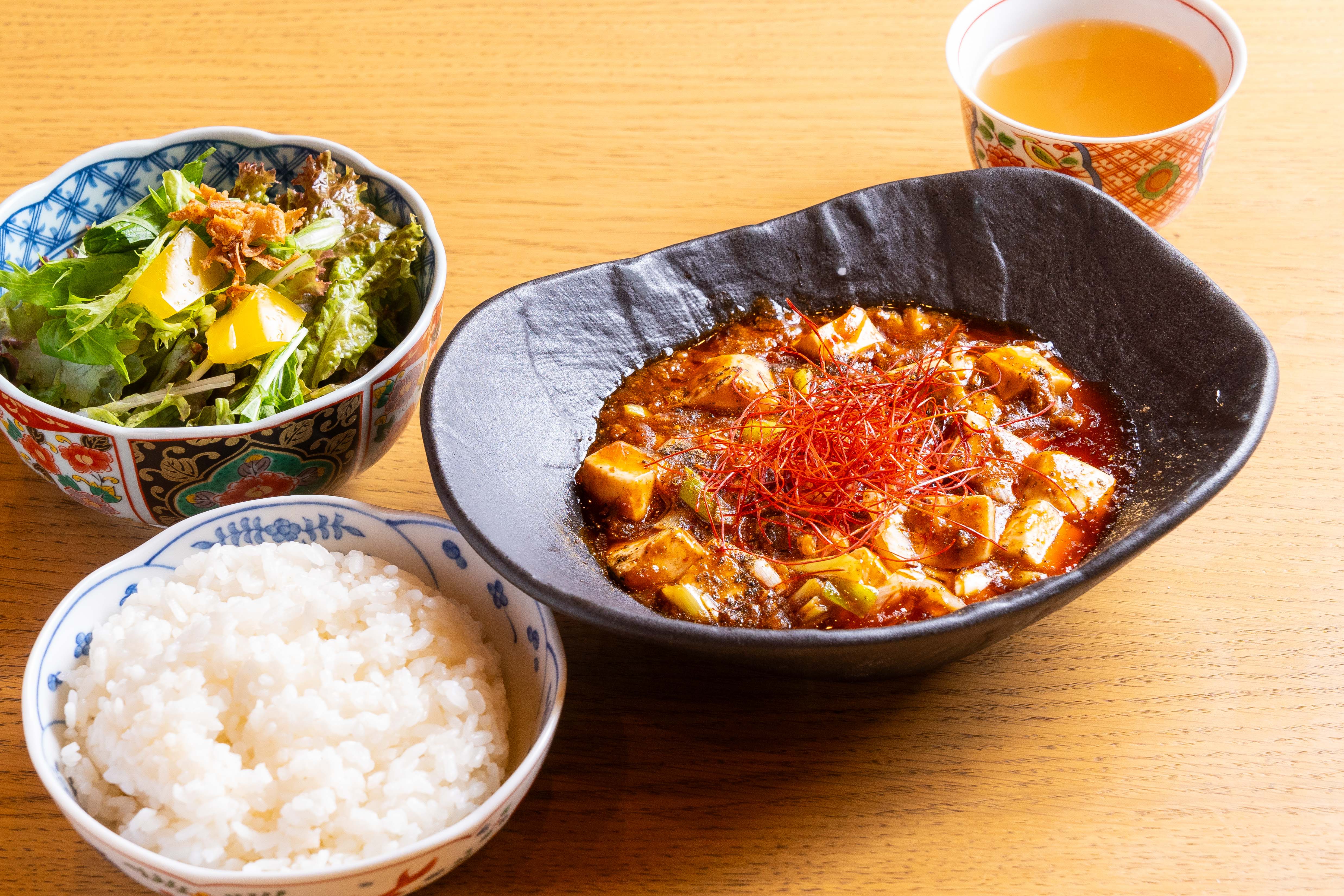 ランチタイムは主に丼ものをご用意。夫の山口大輔が、心斎橋・アメリカ村に月1万5000食(店舗面積9坪)を売り上げたローストビーフ丼専門店「キャメルダイナー」を創業した経験を活かし、超レアな赤身肉と秘伝のニンニク醤油ベースのタレを合わせた「自家製ローストビーフ丼」(980円~、スープ付き)をご提供します。また、「鶏タル天丼」(880円~、スープ付き)もご用意。2001年の創業時から提供しているメニューで、サクサクの鶏天とタルタルソースを合わせてお召し上がりください。さらに、「麻婆豆腐 痺辛ハラスメント」(980円)は、今回のグランドオープンのために開発した新作で辛さがクセになる一品です。