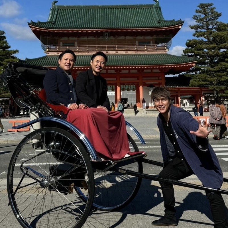 JR京都駅から店舗まで、人力車で送迎するサービスもご用意しております(要予約、5000円~)。ご予算に応じて、近隣の観光地をめぐるコースもお楽しみいただけます。