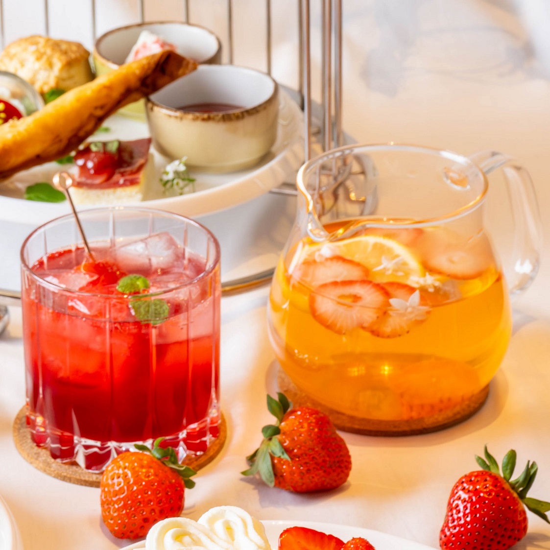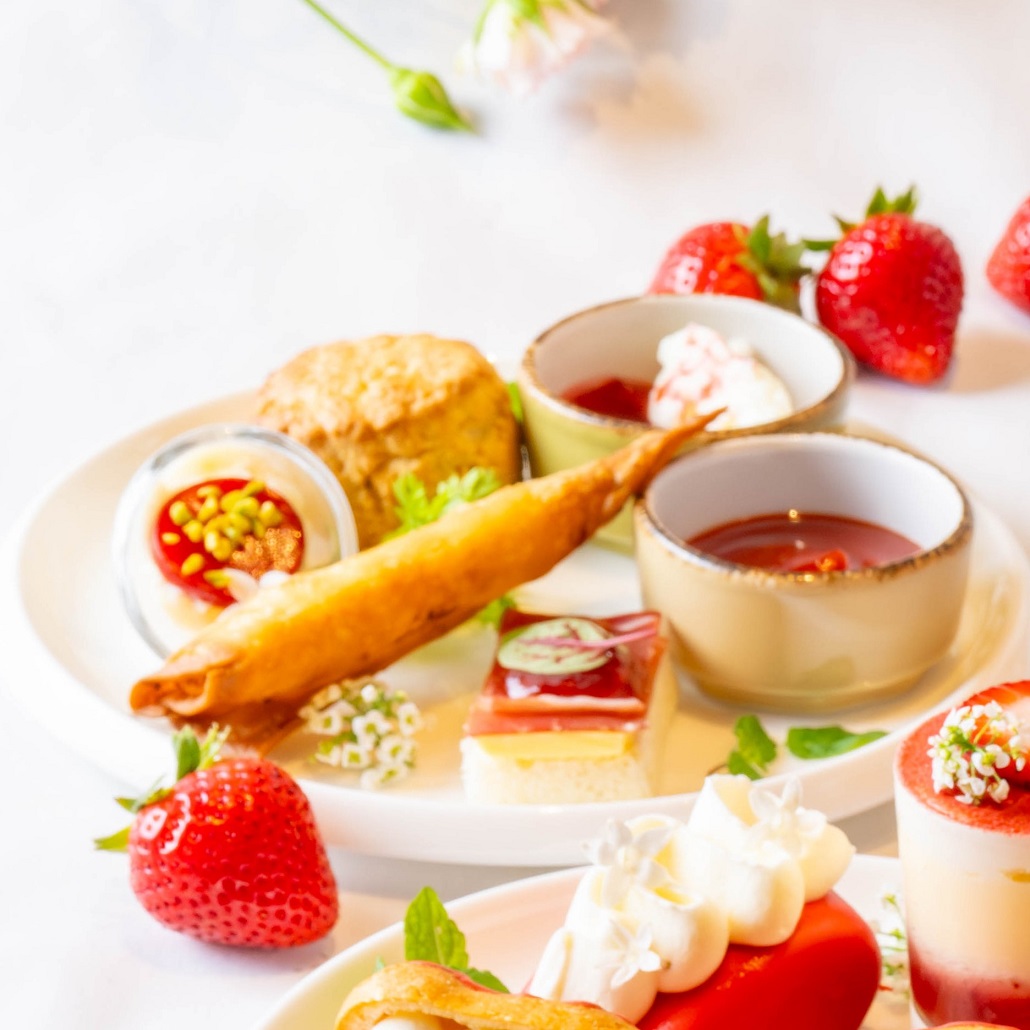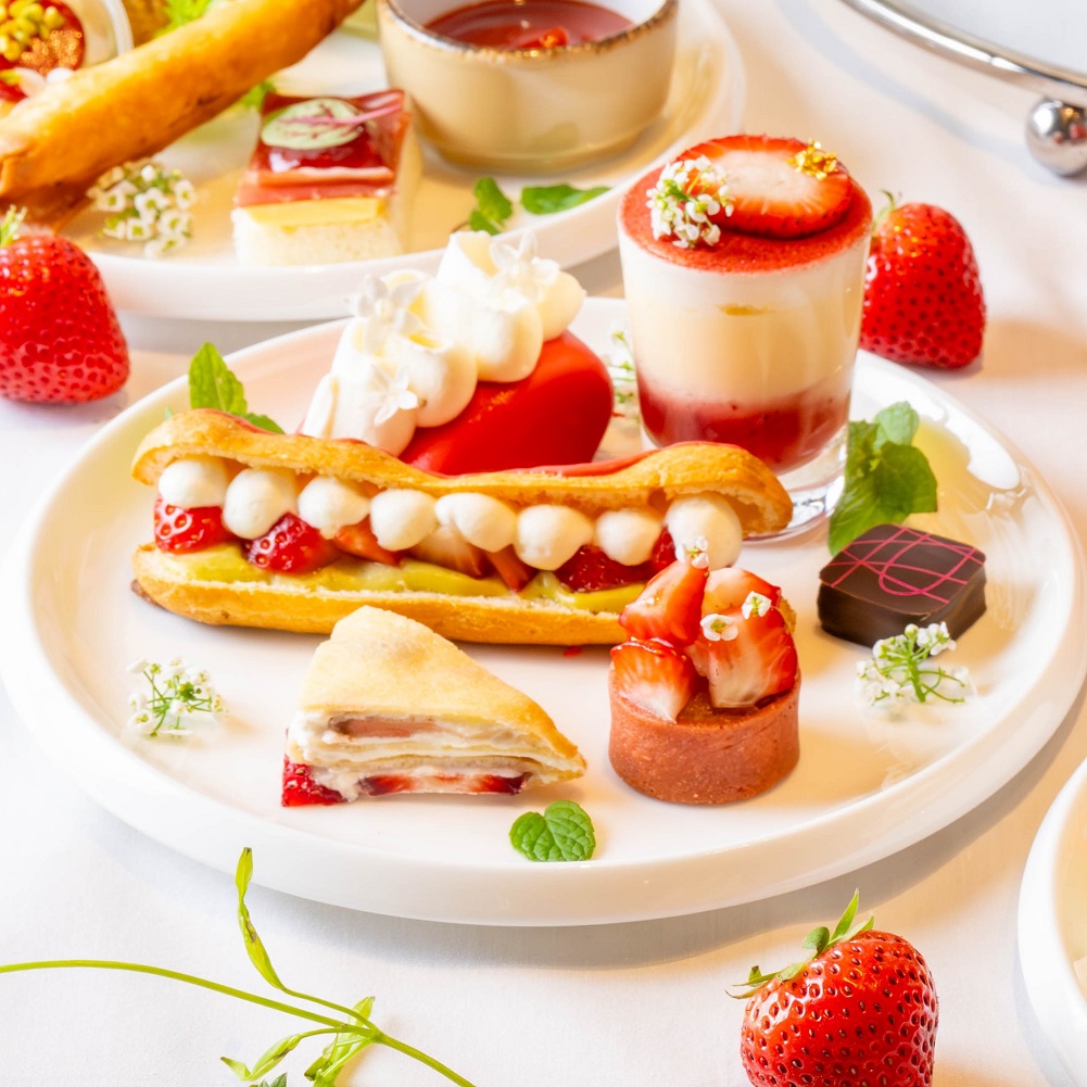 「ストロベリーアフタヌーンティー」では、旬の国産いちごを贅沢に取り入れたスイーツ8品、セイボリー3品を3段スタンドにのせ、オリジナルモクテル、フリーフローのドリンクと共にご提供いたします。1段目には、旬の国産いちご2種類をお客様自身でデコレーションしてお召し上がりいただくミニサイズのショートケーキをご用意。2段目は、ムースやエクレア、タルトなどさまざまないちごを味わえるスイーツ6種類がラインナップ。2段目のスイーツは、バレンタインシーズンはチョコレートをテーマに、さくらの開花シーズンはさくらをテーマに、期間限定メニューで提供します。オリジナルモクテルと共に、時期によって異なるいちごの魅力を存分にお楽しみいただければと思います。