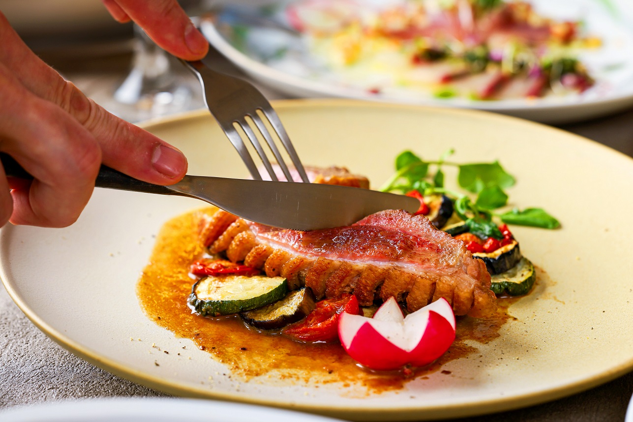 レアに焼き上げた京鴨ロース肉を、鴨のだしとマルサラ酒を合わせたソースでお召し上がり下さい。