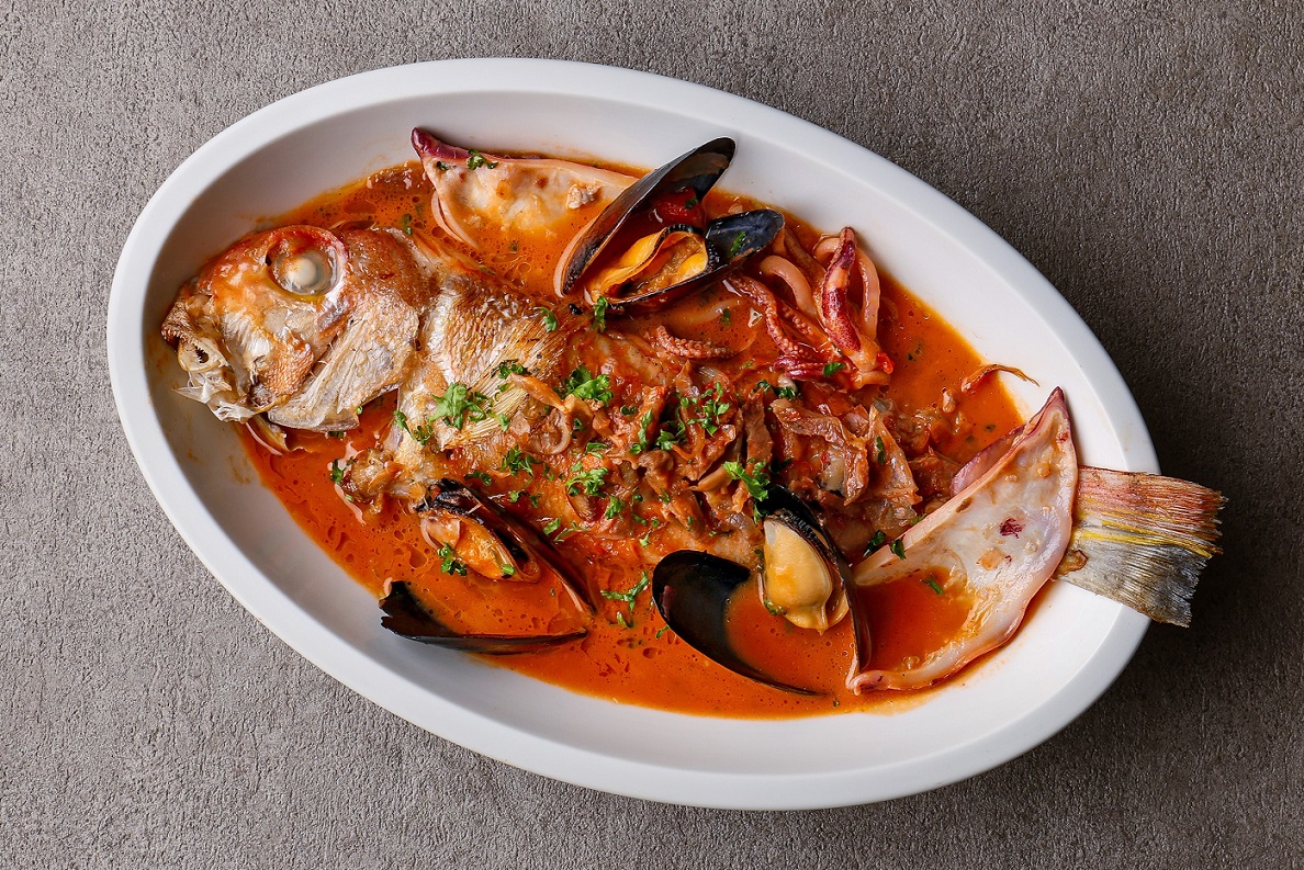 その日仕入れた新鮮な魚を丸ごと1匹使用し、生ムール貝やイカとともにサフランを効かせたトマトスープで煮込んだ一品。
