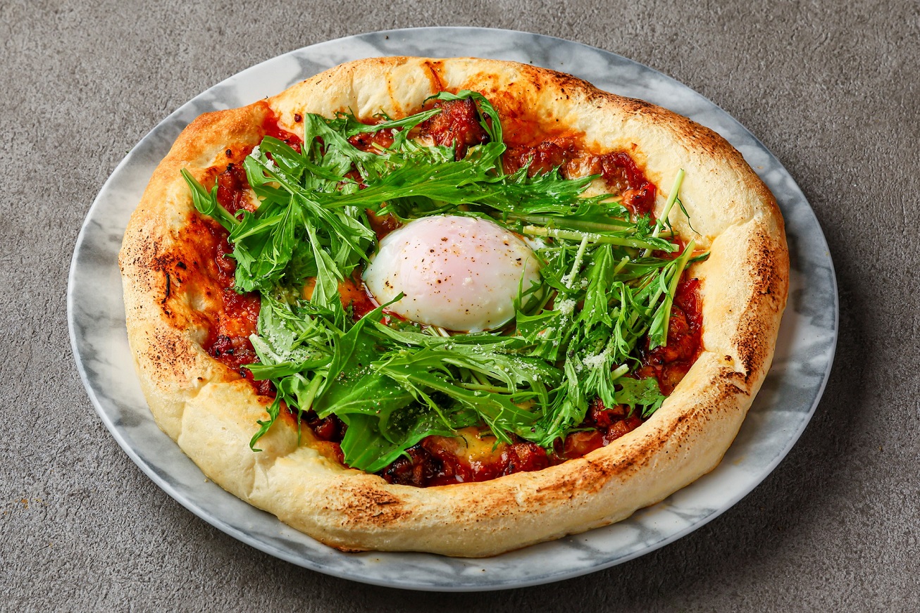 京鴨のラグー、京水菜、半熟卵をのせ、店内で焼き上げた一品。
