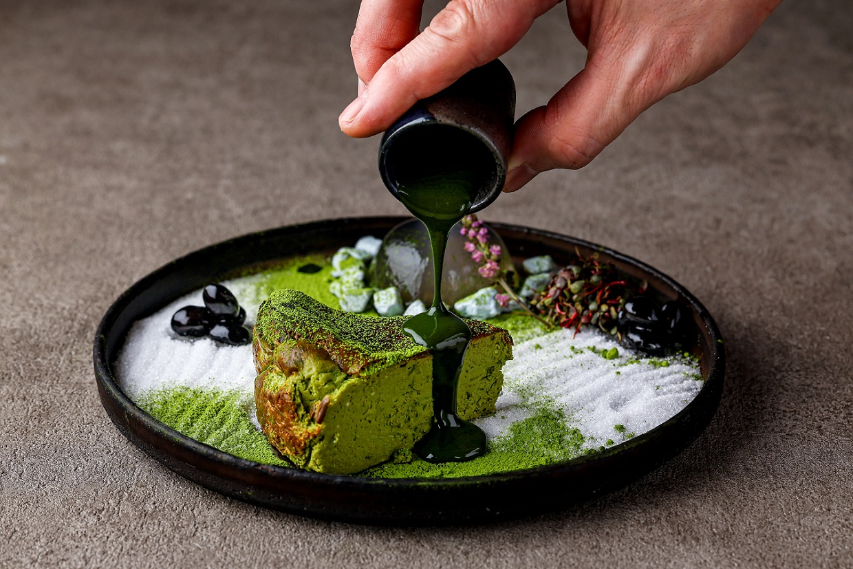 老舗茶屋「小原春香園」の抹茶使用。砂に見立てた粉砂糖や苔石風チョコで“枯山水”を表現したアート系スイーツです。
