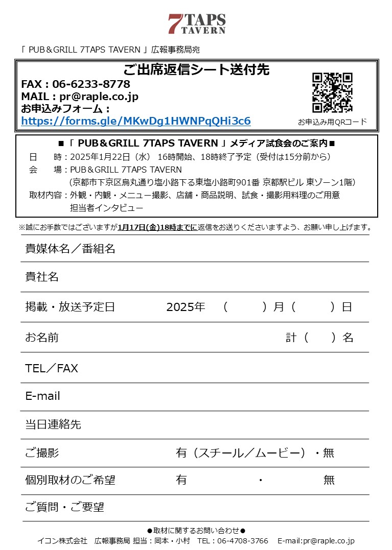 関西を中心に飲食店を展開するイコン株式会社(本社:京都市下京区、代表取締役:佐野哲也)は2025年1月24日(金)、オールデイダイニング「PUB&GRILL 7TAPS TAVERN(セブンタップス タバン)」を京都駅ビル東ゾーン 1階にオープンします。オープンに先駆け、1月22日(水)にメディア試食会を開催します。