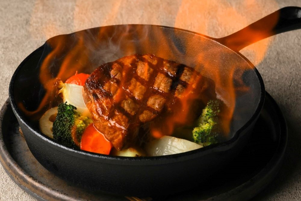 サロマ黒牛のモモ肉と京野菜を豪快にグリル。お客様の目の前でフランベし、テキーラの香りで仕上げます。