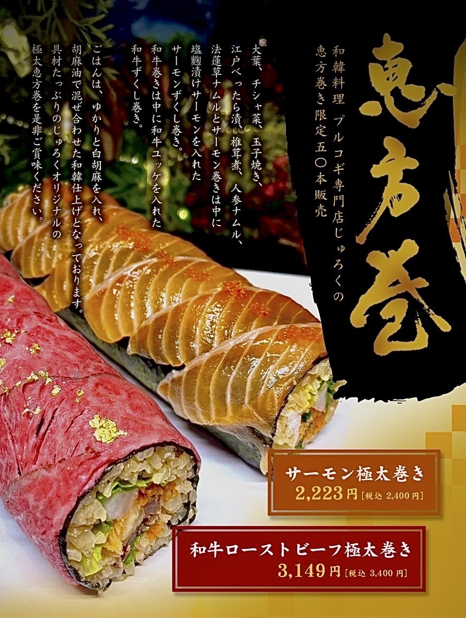 「和韓料理 プルコギ専門店 じゅろく」では、ニンジンやホウレン草などの自家製ナムルを使用し、ゆかりと白ごま、ゴマ油を混ぜ込んだご飯で巻いた“キンパ風恵方巻”2種類をご用意。「サーモン極太巻き」(2,400円)は、濃厚な味わいの塩麹付けサーモンを中に巻き、表面には特製醤油ダレに漬け込んだサーモンを巻いて仕上げました。「和牛ローストビーフ極太巻き」(3,400円)は、和牛ユッケを中に巻き、和牛ローストビーフのスライスをのりが見えなくなるまで贅沢に巻きました。