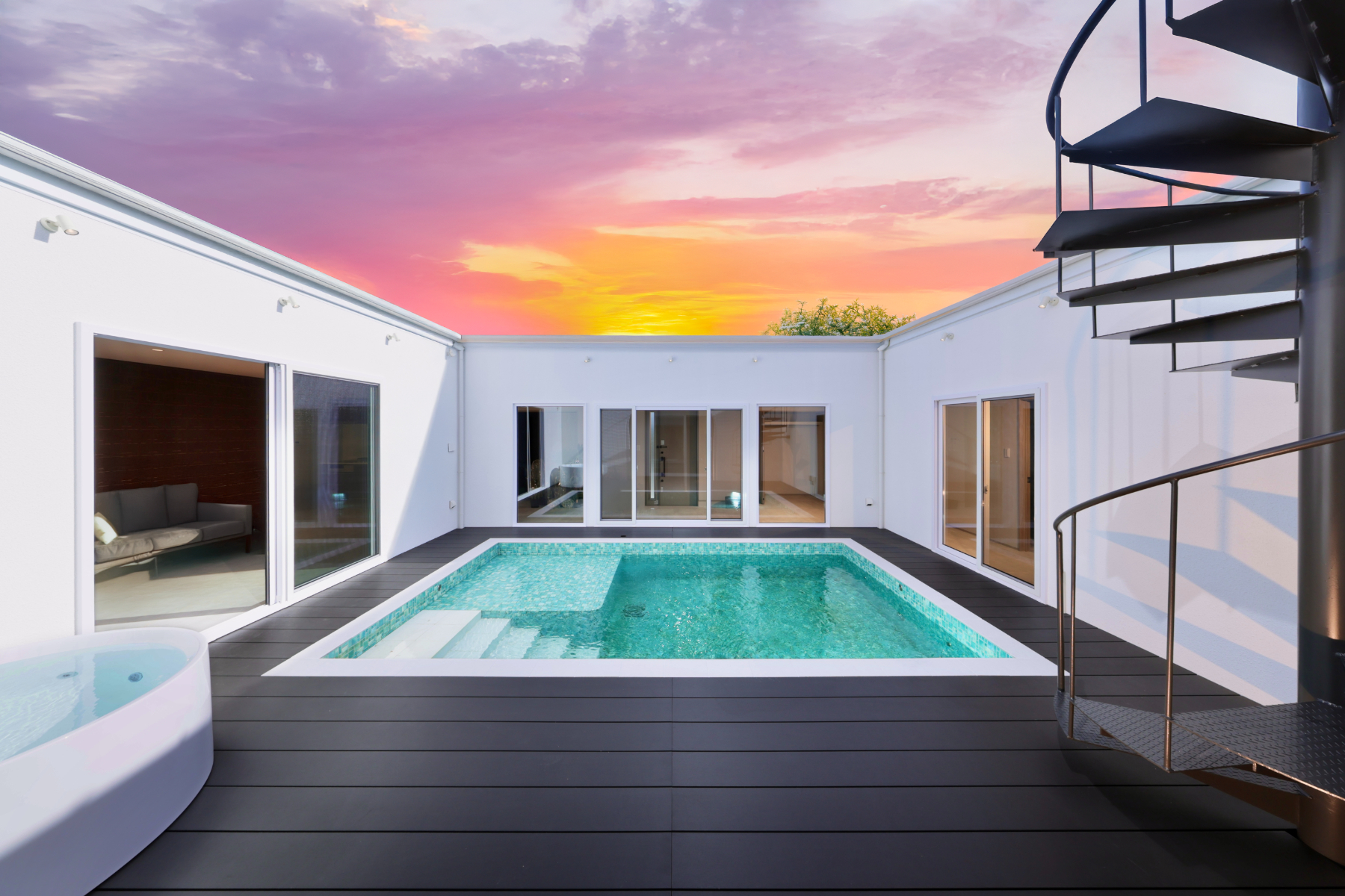 「クリスタルヴィラ白浜パークサイド」は、全5棟からなる、1棟1棟独立したプライベートヴィラです。アドベンチャーワールドまで徒歩約10分の好アクセスで、高台から眺める景色も息をのむほどの絶景です。白浜の砂のように白を基調とした外装で、内装は棟により異なるため、お好みで選んだり、「次回くるときは別の部屋を」と「また来たくなる」デザインを目指しました。ベッドはシモンズ、布団は西川、家電はバルミューダなど家具・家電にもこだわりました。1棟に12名まで泊まれるため、海外の旅行客を含む大人数での宿泊にも対応。プールサイドで楽しめるBBQのほか、熊野牛すき焼き、和歌山名物のクエ鍋など、土地の魅力を感じられる料理もご用意しております。眼下に広がる絶景(視覚)、自然が奏でる音(聴覚)、天然温泉(触覚)、土地の食材を生かした料理(味覚、嗅覚)など五感を刺激し、非日常空間へ旅行者を誘(いざな)います。