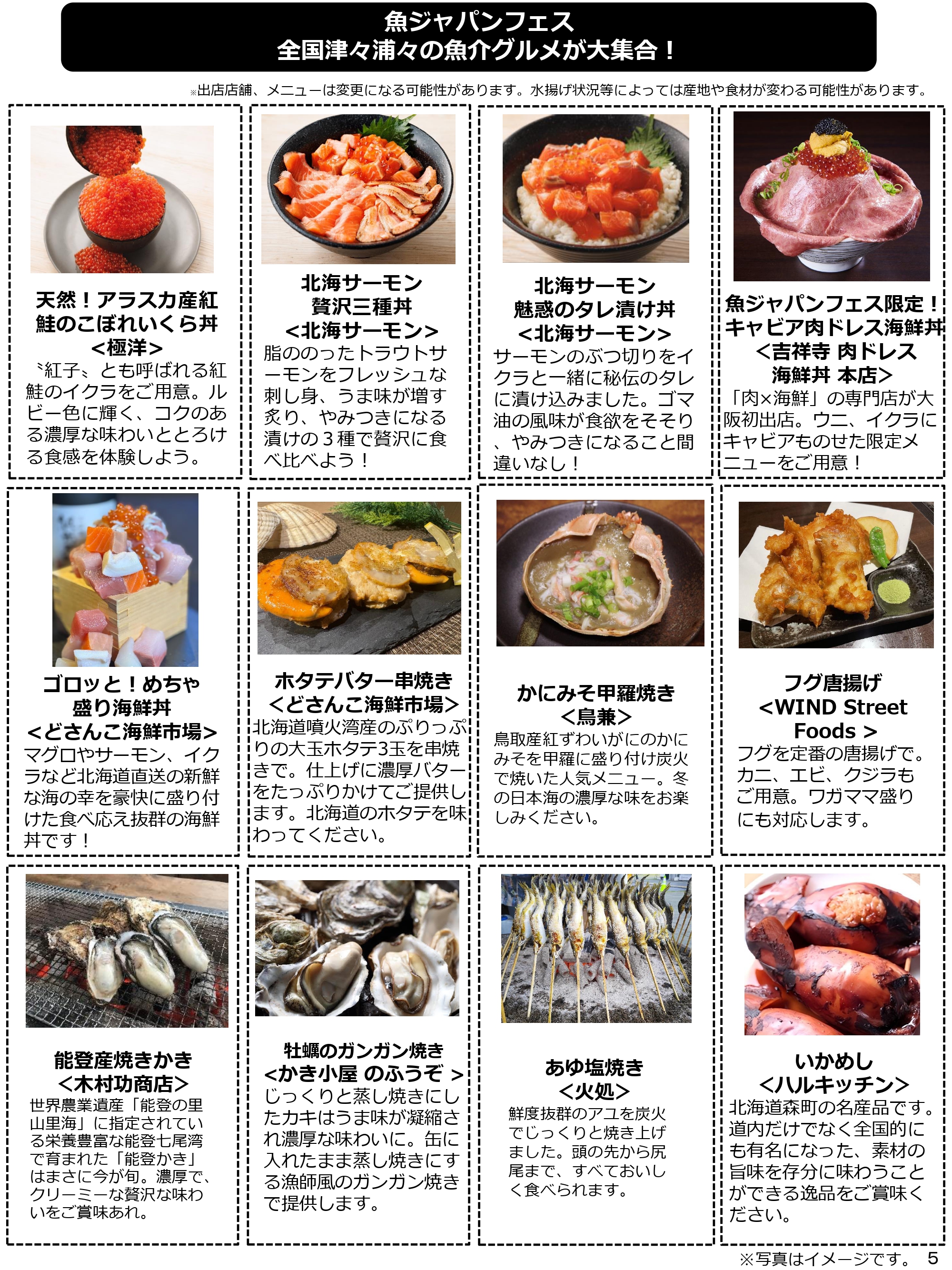 マグロ、サーモン、カニ、イクラ、カキ、ホタテなどの旬で新鮮な魚介が大集合。海鮮丼や漁師飯、郷土料理、鍋料理、海鮮ラーメン、海鮮パエリアなど和洋中のメニューが勢ぞろい。