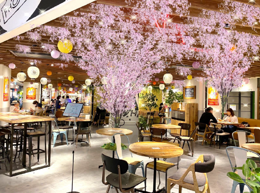 フードホール内の「シェアゾーン」には、写真・SNS映え必須の3本の巨大な桜の木が出現!おひとりでも友達同士でも手ぶらで気軽にゆったりと天候問わず美味しいお料理とお花見が楽しめます。つい写真を撮りたくなる本物の木の幹が付いた桜の木を背景に、ご飲食いただきながらお花見気分をご堪能ください。