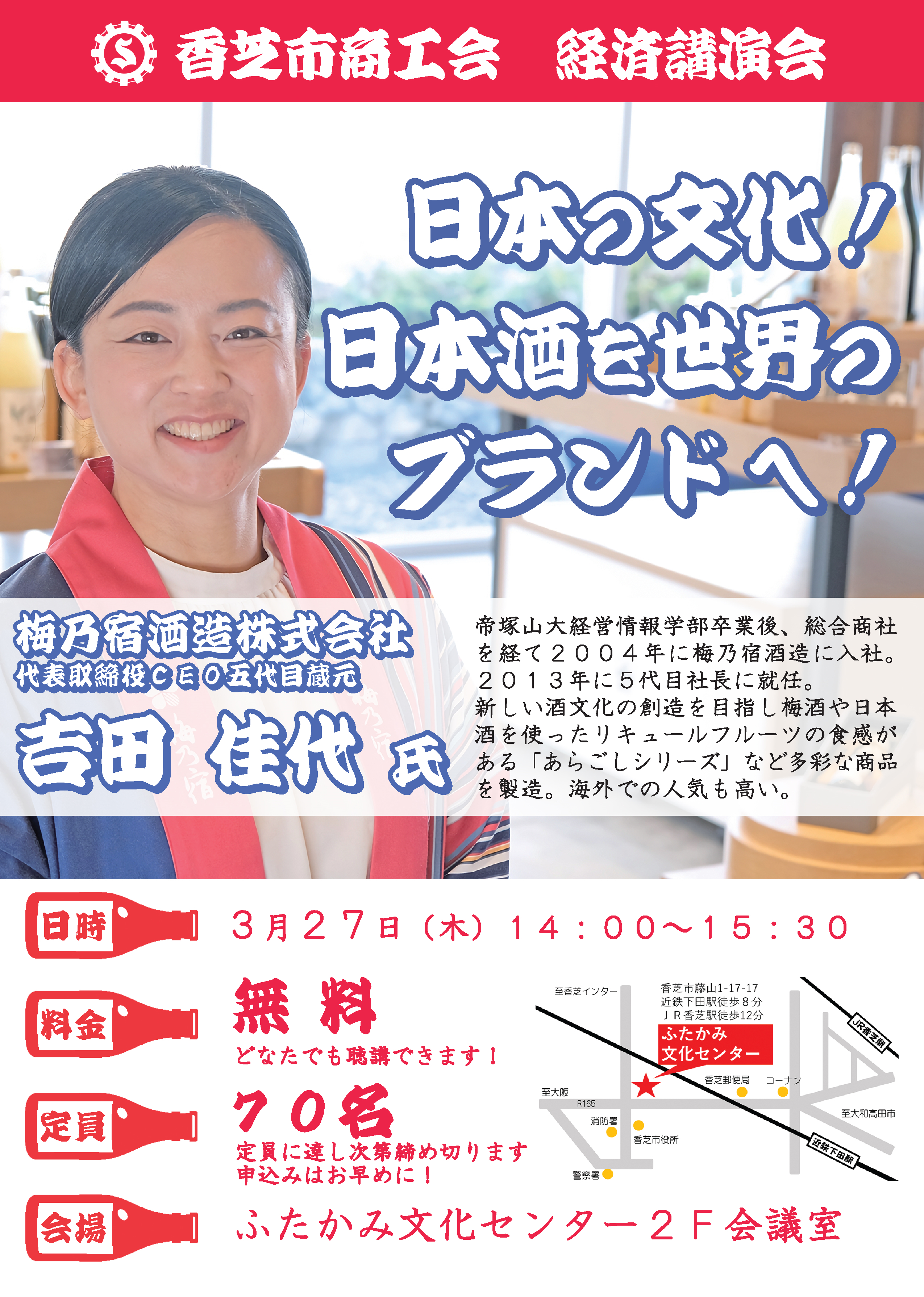 香芝市商工会(所在地:奈良県香芝市)は、梅乃宿酒造株式会社 代表取締役CEOの吉田 佳代氏を講師に迎え、経済講演会を2025年3月27日(木)に開催することをご報告いたします。
