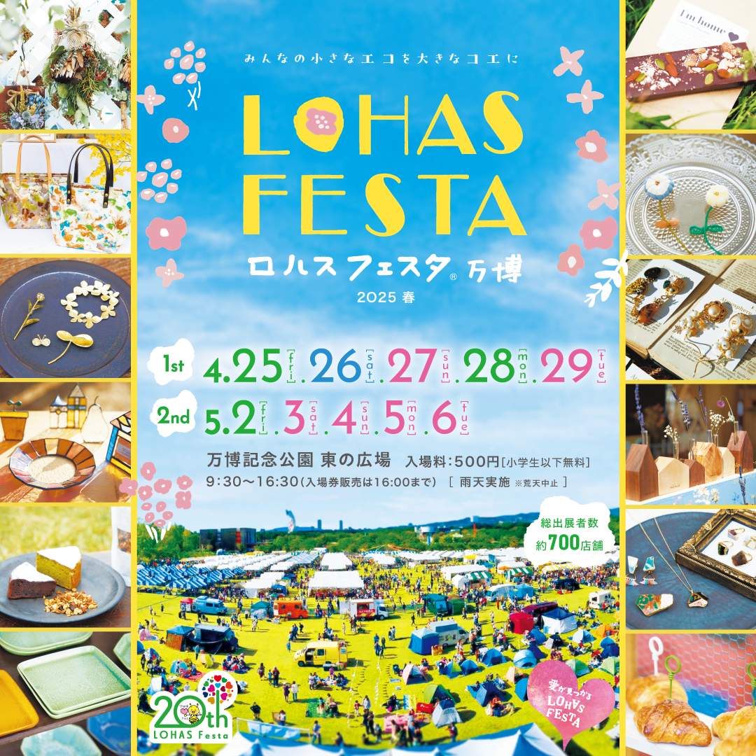 「オシャレにかわいくエコを実践しよう」と始まったロハスフェスタ。 初開催から20年目を迎え、マイ食器やマイバッグも持参する 「エコを楽しむイベント」としてすっかり根づいてきました。 今回も一点モノの手作り雑貨やアンティーク作品、こだわり食材のフードなど、約700店舗が大集合します。