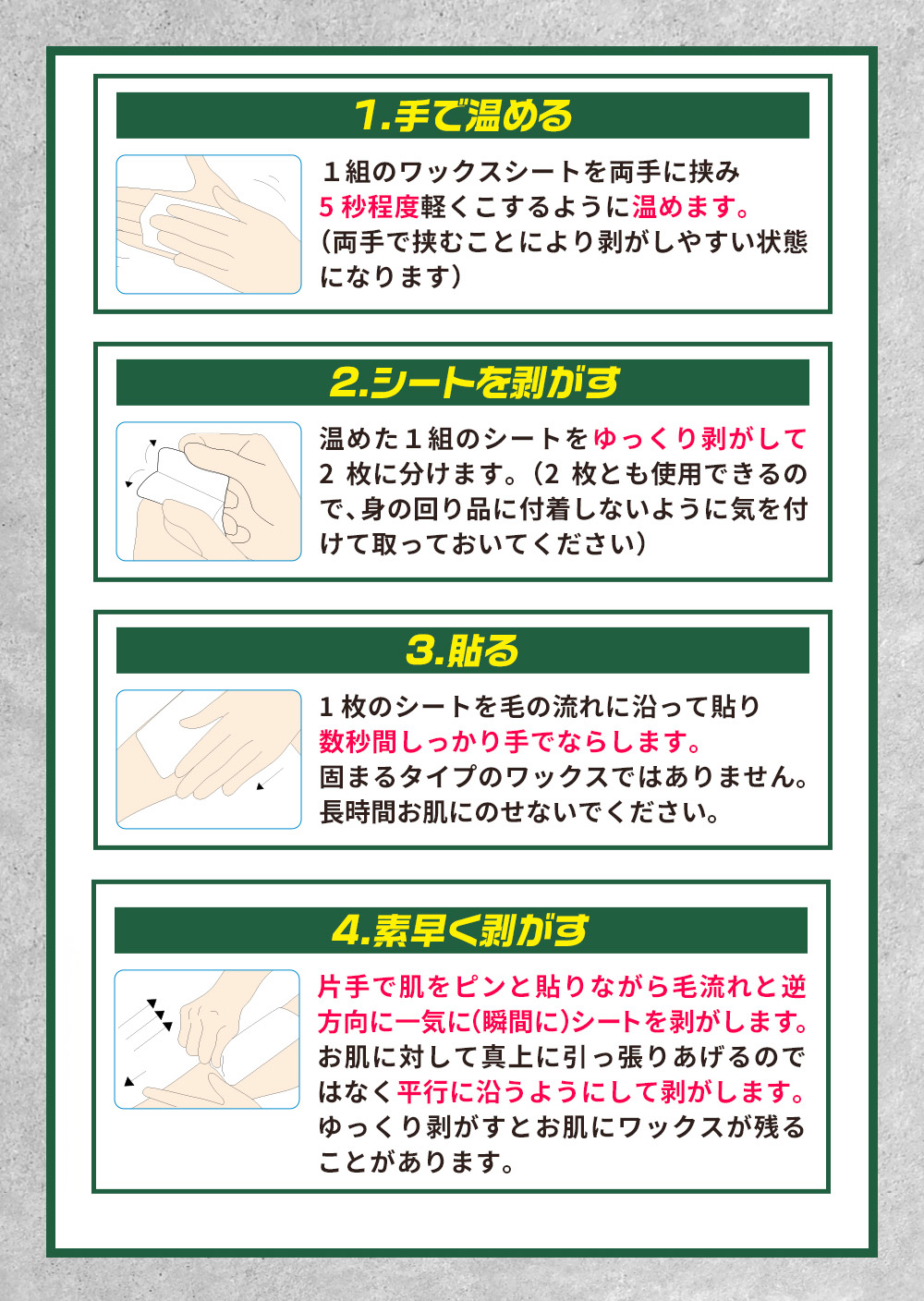 ④素早く剥がす 片手で肌をピンとはりながら毛流れとは逆方向に一気にシートを剥がします。 お肌に対して真上に引っ張り上げるのではなく、平行に沿うようにして剥がします。 ※ゆっくり剥がすとお肌にワックスが残ることがあります。