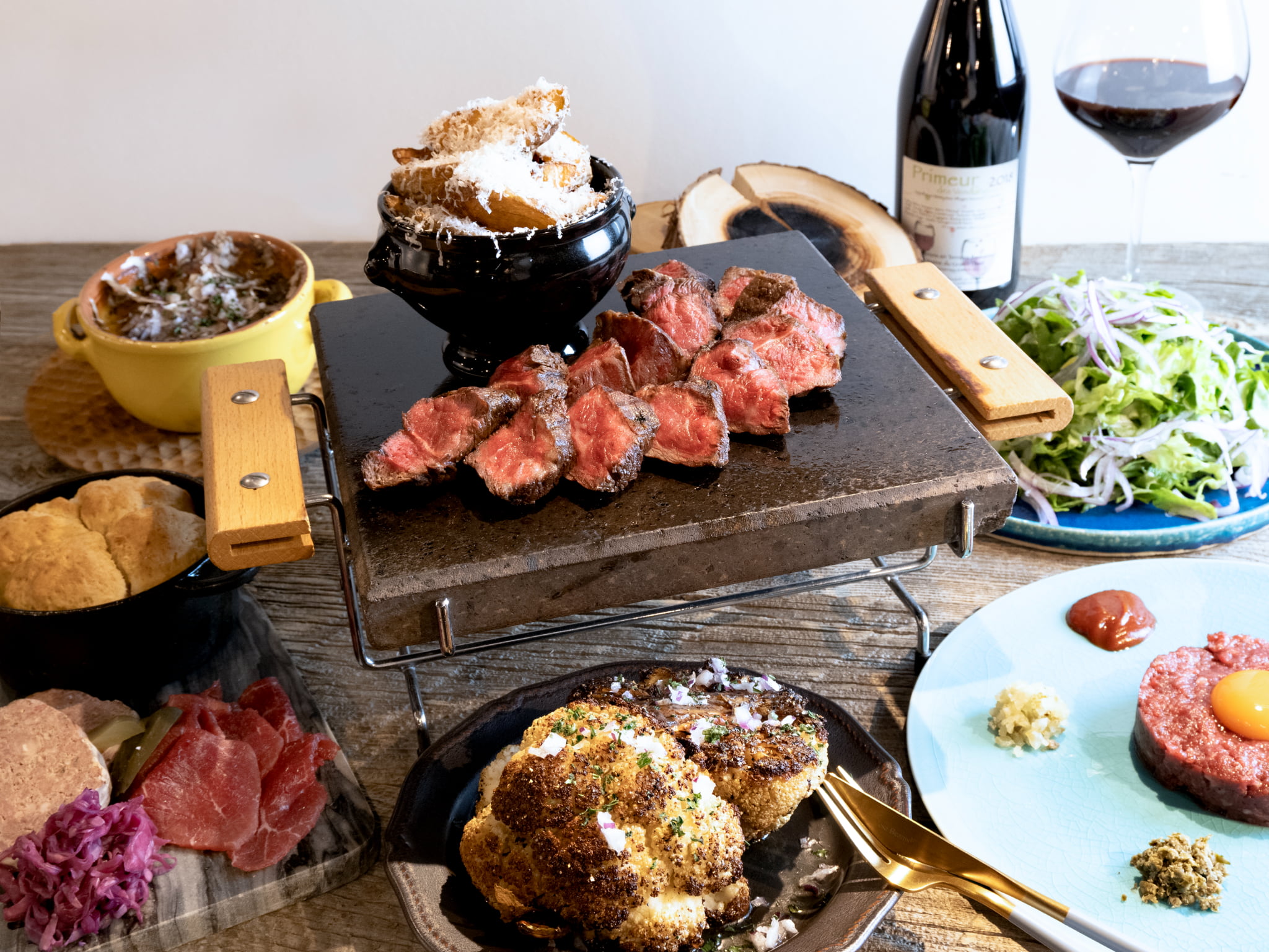 フランス・パリ18区に本店を構える『肉ビストロ』、サクレフルールは、フランス人のソウルフードである『ステック・フリット』(ステーキとフライドポテトの組み合わせ)を提供し、シンプルに肉の美味しさを追求する伝統的なフレンチビストロです。名物のステック・フリットは300g以上のステーキをご注文いただくと、約30mmの厚さのホットストーンにのせて提供されます。フランス・パリ18区に本店を構える『肉ビストロ』、サクレフルールは、フランス人のソウルフードである『ステック・フリット』(ステーキとフライドポテトの組み合わせ)を提供し、シンプルに肉の美味しさを追求する伝統的なフレンチビストロです。名物のステック・フリットは300g以上のステーキをご注文いただくと、約30mmの厚さのホットストーンにのせて提供されます。