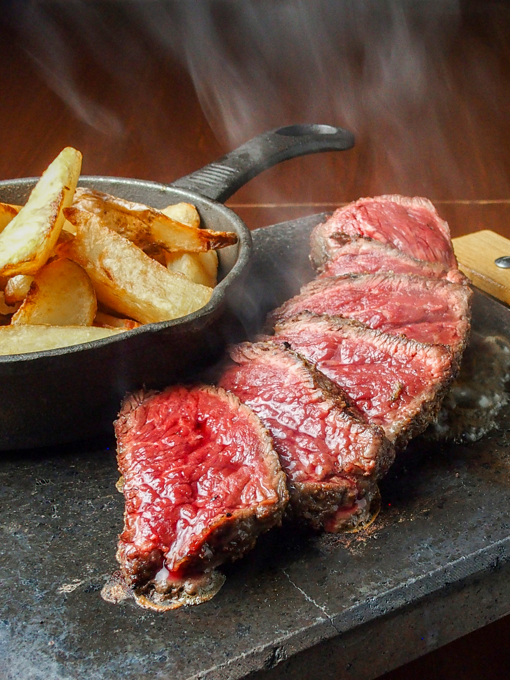 旨味を閉じ込めた塊肉のステーキを、外国発信では珍しい天然石のホットストーンを使った火入れでレアからウェルダンまで、自身の好みの焼き加減で食べられる1 品。付け合わせのフライドポテトは食べ放題。