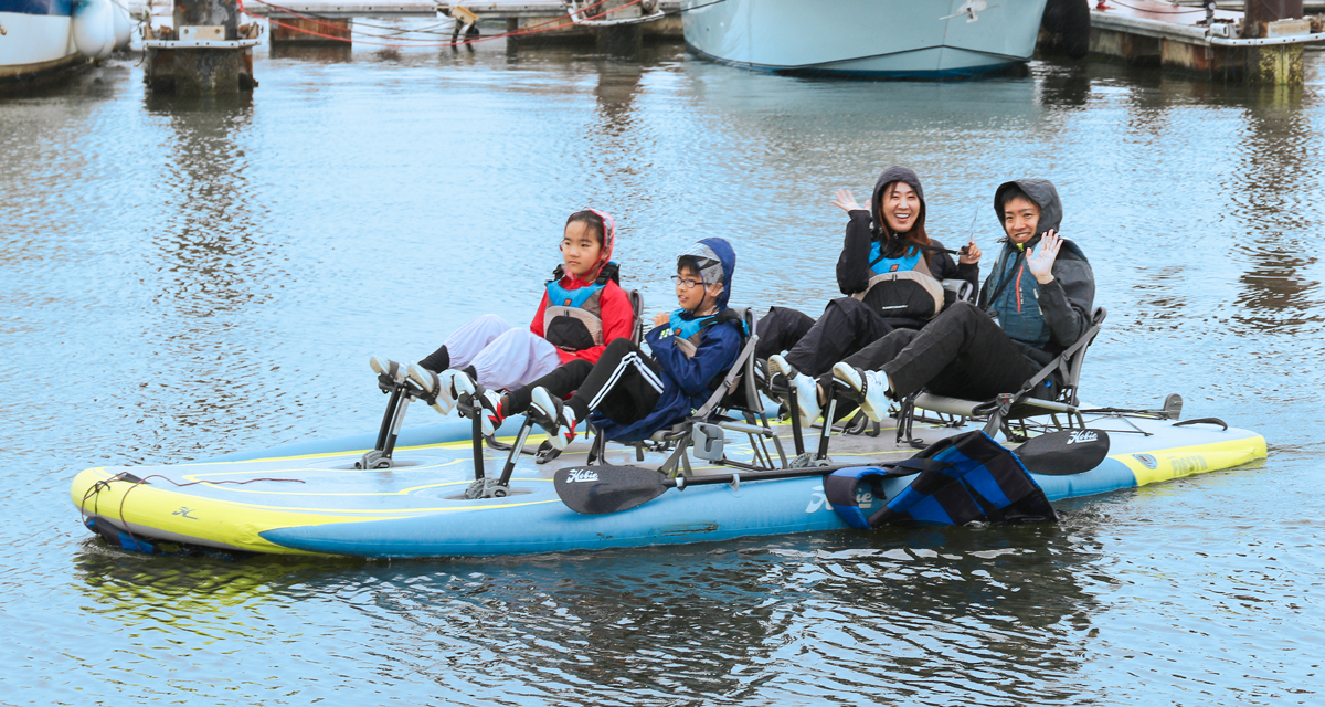 足こぎ式で安定感抜群!両手が自由なので写真撮影にもおすすめ。1人が漕ぐだけでもしっかり進むので、小さなお子様がいるご家族でも安心。ファミリーに特におすすめの4人乗りボードです。