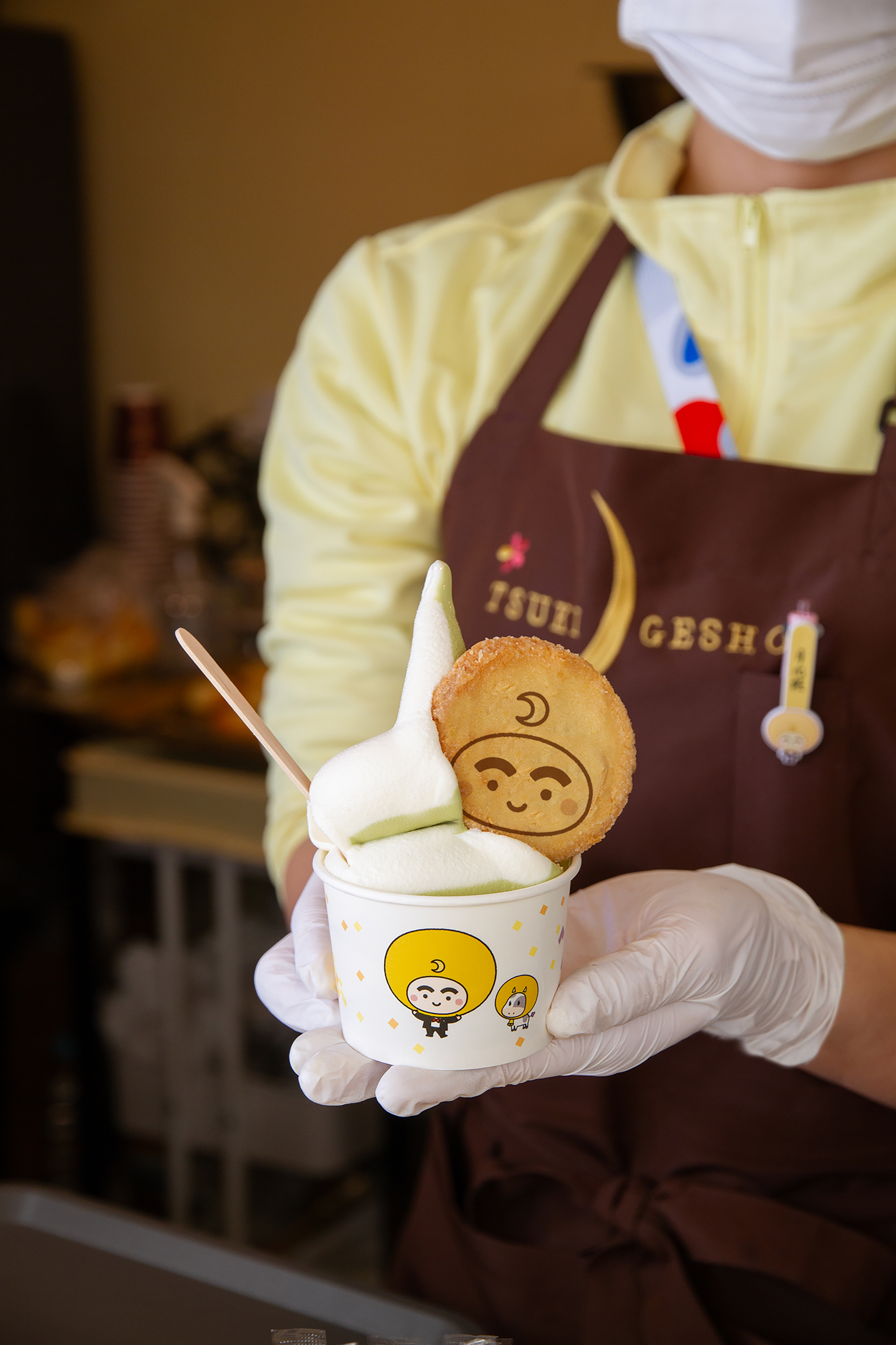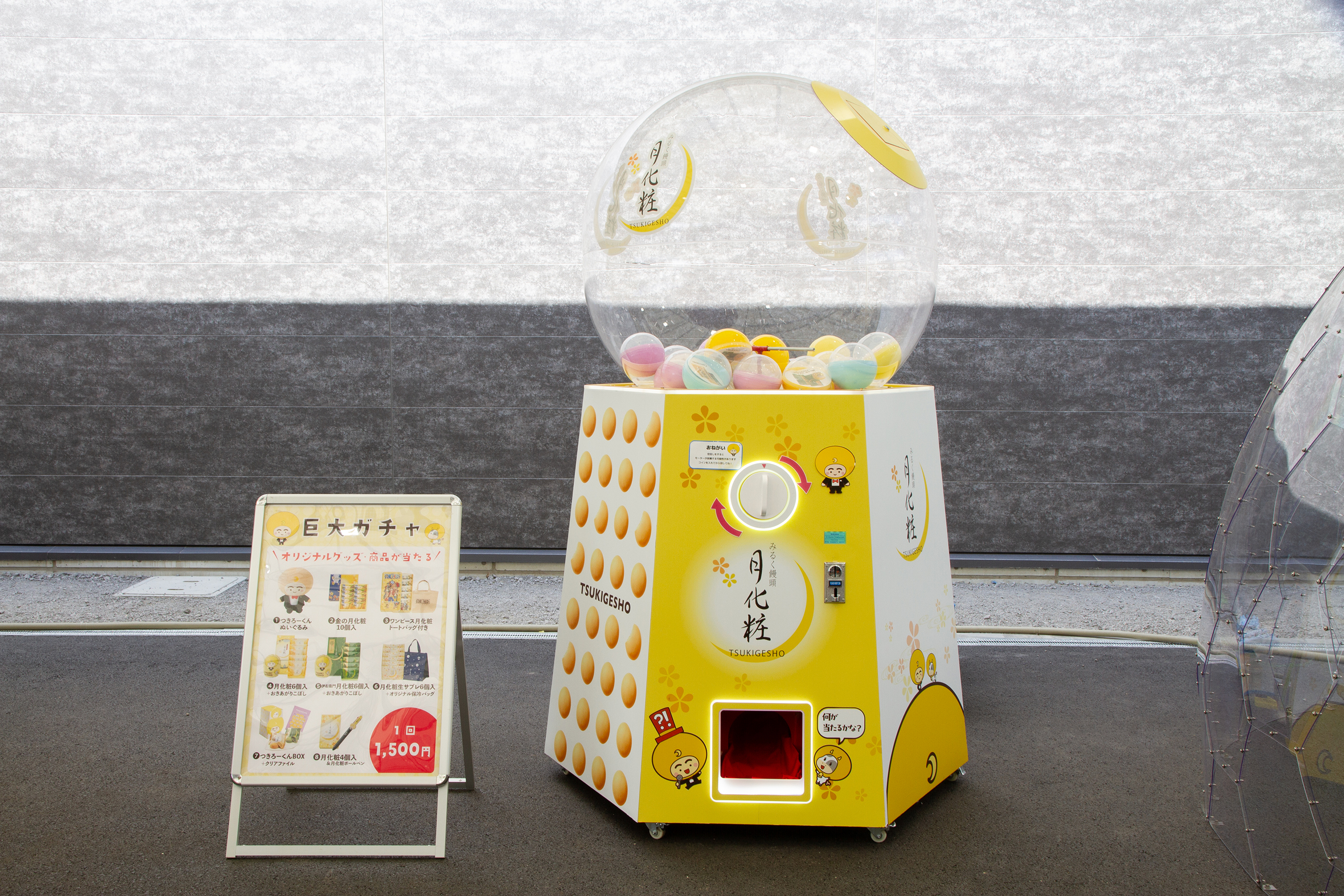 他にも、月化粧プリンや、わらび餅、大阪名物のミックスジュースなども販売しています。これからの季節にぴったりのソフトクリームも販売中。店舗奥には巨大ガチャがあり、1 回 1500 円で月化粧キャラクターのつきろーくんのぬいぐるみやコラボ商品「ONE PIECE 月化粧」などのオリジナルグッズや商品が当たります。もちろん大阪土産に「みるく饅頭月化粧」も販売しています。「伊右衛門抹茶月化粧」やおまんじゅうで日本初の機能性食品「金の月化粧」も購入できますので、ぜひお立ち寄りください。